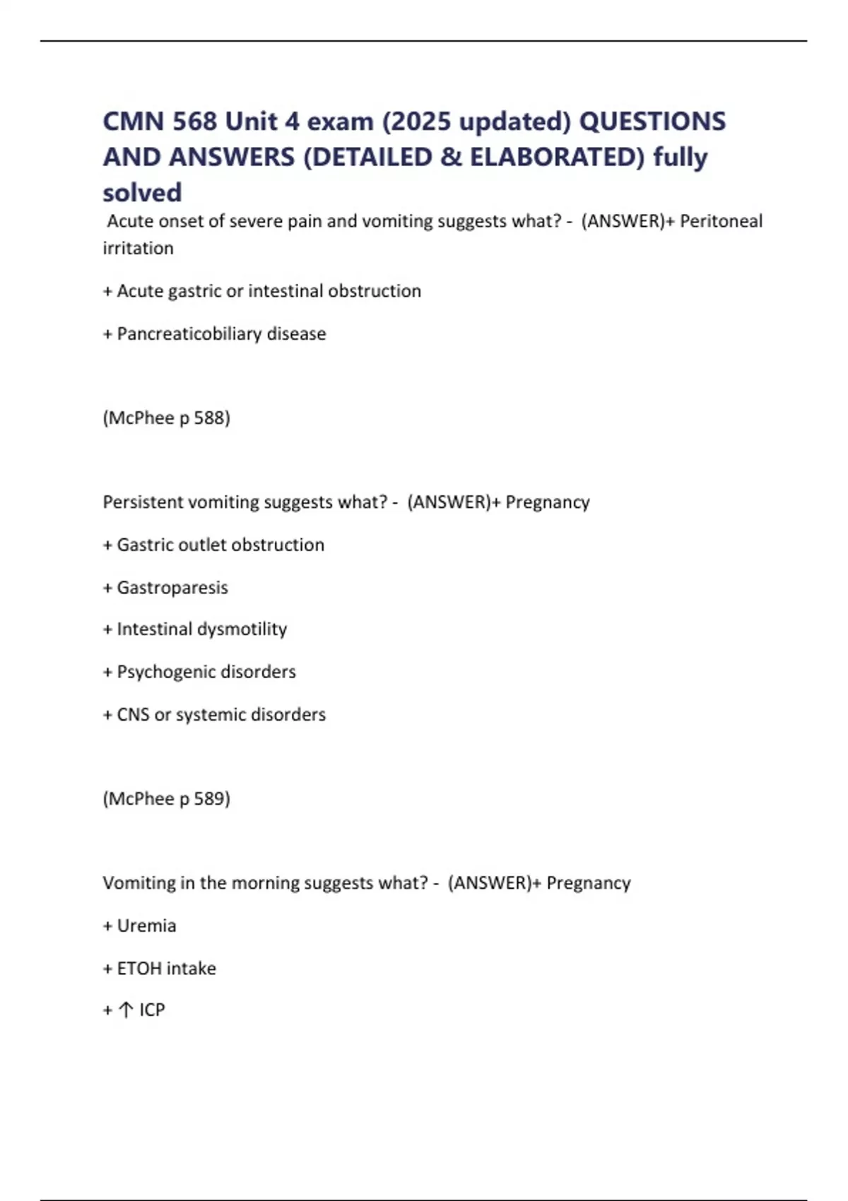 Vomiting in the morning suggests what? - (ANSWER)+ Pregnancy