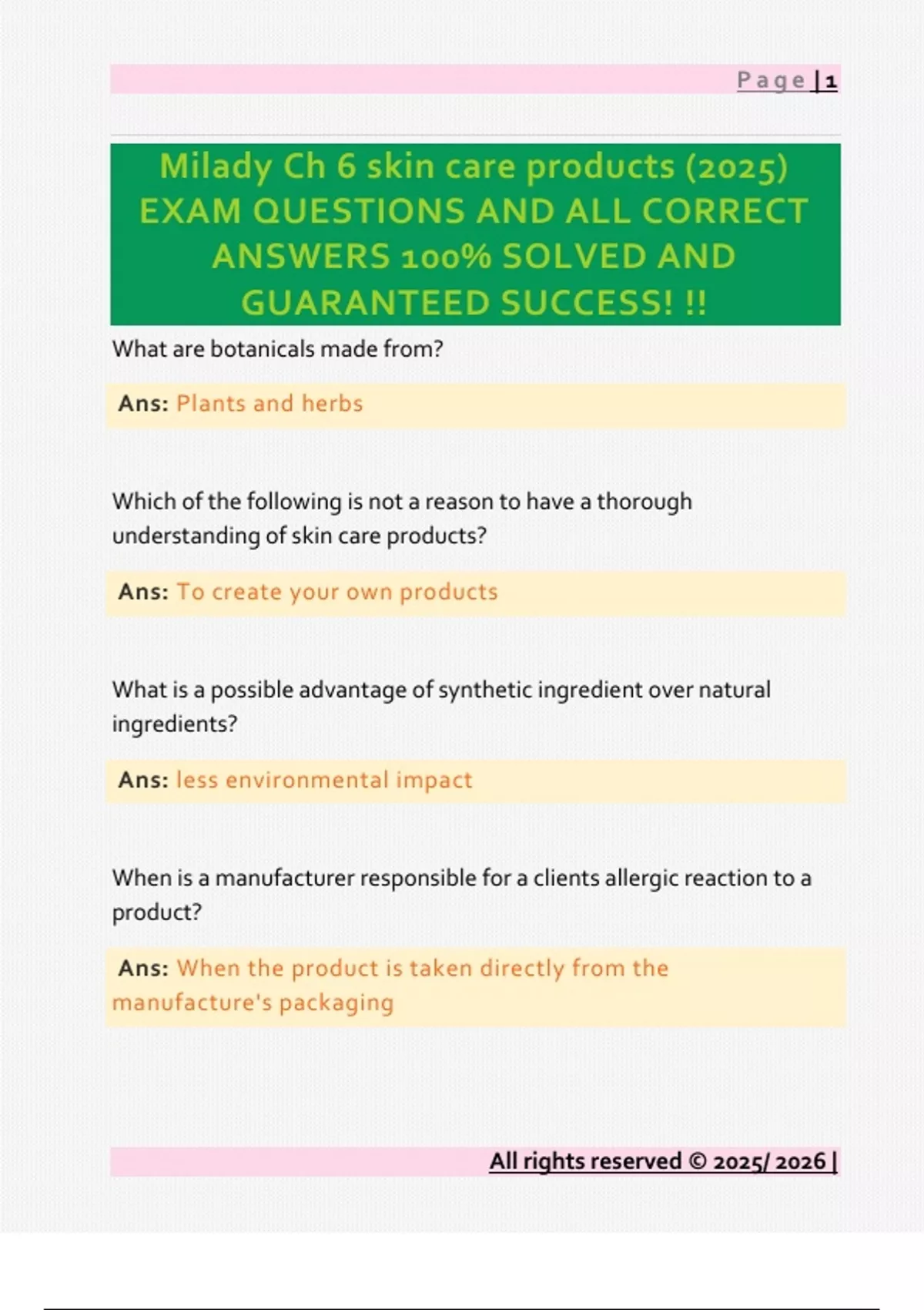 Milady Ch 6 skin care products (2025) EXAM QUESTIONS AND ALL CORRECT ANSWERS 100% SOLVED AND GUARANTEED SUCCESS! !!