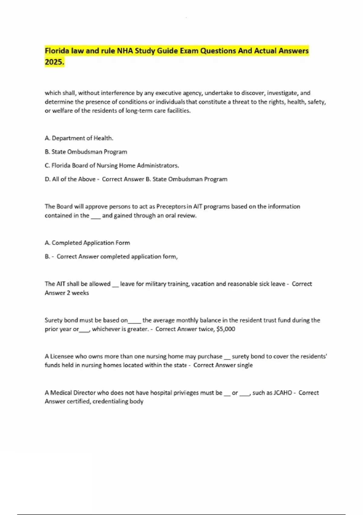 Florida law and rule NHA Study Guide Exam Questions And Actual Answers 2025.