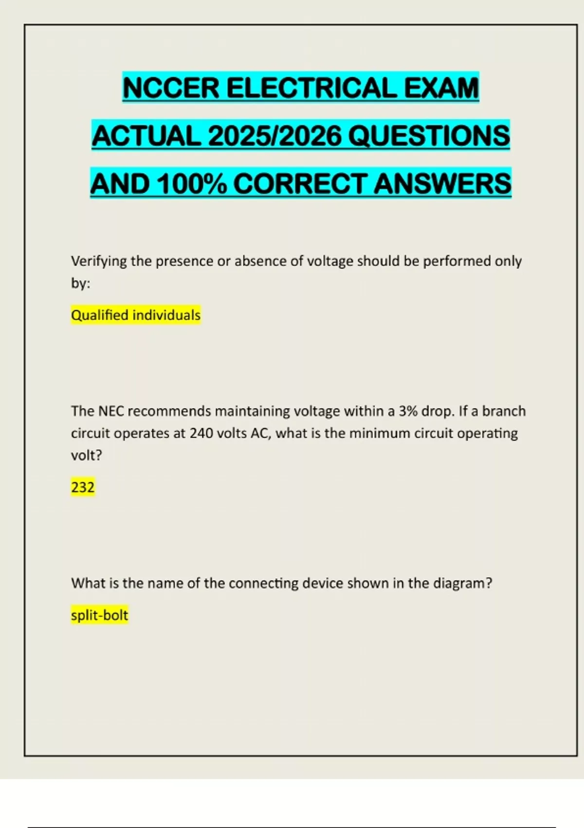 NCCER ELECTRICAL EXAM ACTUAL 2025/2026 QUESTIONS AND 100% CORRECT ANSWERS Verifying the presence or absence of voltage should be performed only by: Qualified individuals The NEC recommends maintaining voltage within a 3% drop. If a branch circuit operates at 240 volts AC, what is the minimum circuit operating volt? 232 What is the name of the connecting device shown in the diagram? split-boltThe volt amperes in an AC circuit is the same as Apparent power What is the voltage drop for a #8 (16.150 cmil) copper wire at 120v. 215 feet one way and load of 39amps? 13.1 If a voltage source of a circuit provides 240 volts and there are 5 ohms of resistance, how much current is in the circuit 48amps What should be done to change rotation of a 3-phase motor? swap any two T leads What instrument is used to measure current? AmmeterWhich plan indicates the location of structures and equipment on a property? Detail drawing Generally, the most ideal conductor is made of: Copper 3 multiple choice options What is the standard size system used in the US? AWG What is insulating tape? Non-Conductive adhesive t