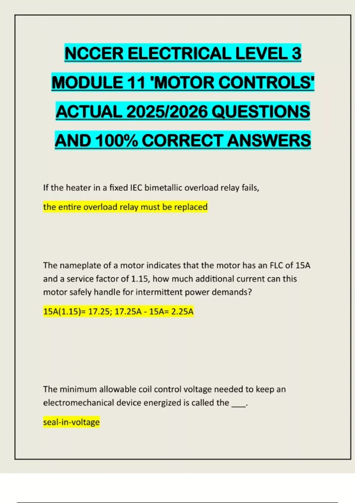 NCCER ELECTRICAL LEVEL 3 MODULE 11 'MOTOR CONTROLS' ACTUAL 2025/2026 QUESTIONS AND 100% CORRECT ANSWERS If the heater in a fixed IEC bimetallic overload relay fails, the entire overload relay must be replaced The nameplate of a motor indicates that the motor has an FLC of 15A and a service factor of 1.15, how much additional current can this motor safely handle for intermittent power demands? 15A(1.15)= 17.25; 17.25A - 15A= 2.25A The minimum allowable coil control voltage needed to keep an electromechanical device energized is called the ___. seal-in-voltageA general purpose NEMA e