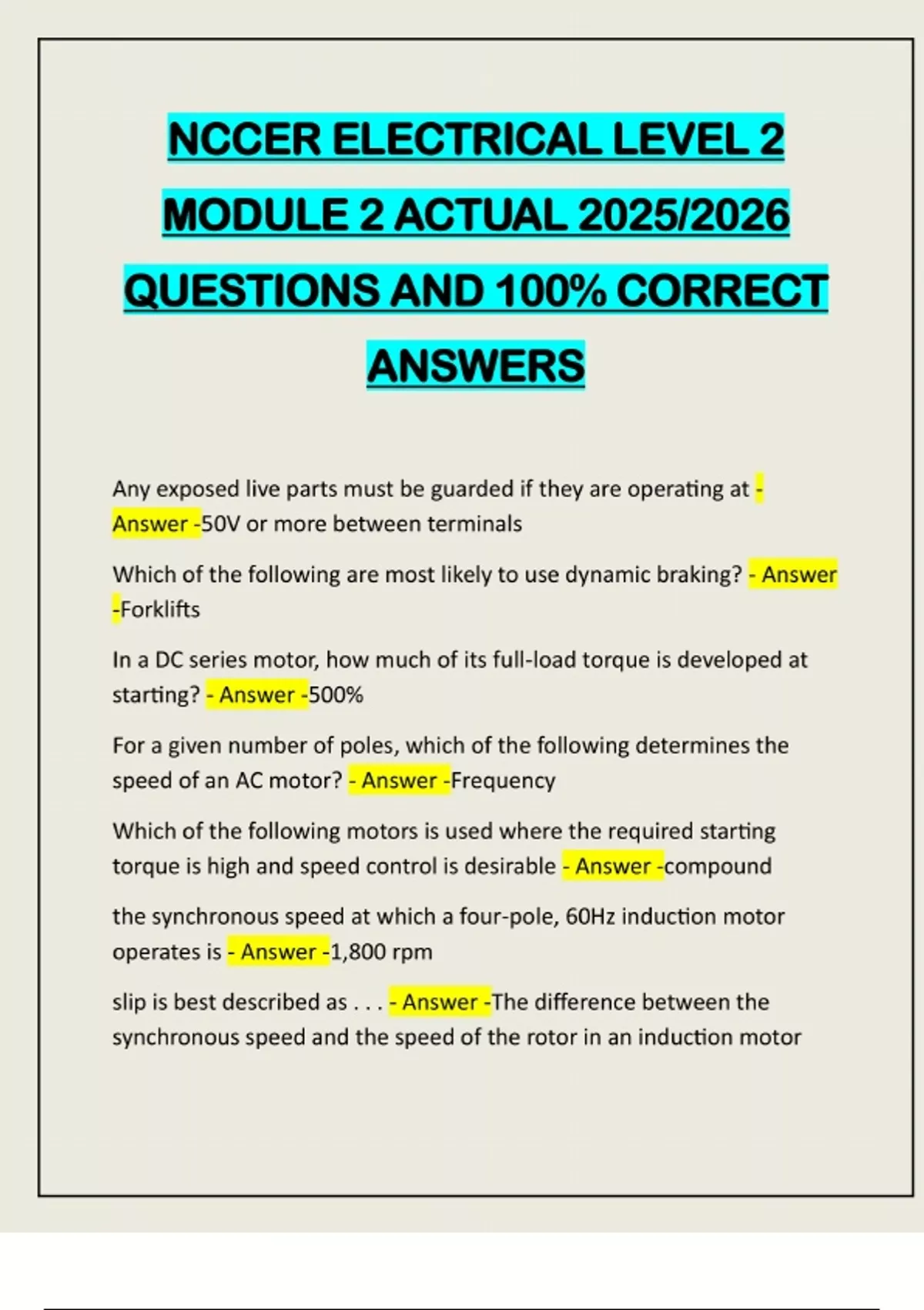 NCCER ELECTRICAL LEVEL 2 MODULE 2 ACTUAL 2025/2026 QUESTIONS AND 100% CORRECT ANSWERS Any exposed live parts must be guarded if they are operating at - Answer -50V or more between terminals Which of the following are most likely to use dynamic braking? - Answer -Forklifts In a DC series motor, how much of its full-load torque is developed at starting? - Answer -500% For a given number of poles, which of the following determines the speed of an AC motor? - Answer -Frequency Which of the following motors is used where the required starting torque is high and speed control is desirable - Answer -compound the synchronous speed at which a four-pole, 60Hz induction motor operates is - Answer -1,800 rpm slip is best described as . . . - Answer -The difference between the synchronous speed and the speed of the rotor in an induction motorWhich of the following motor operate on the principle of a rotating magnetic field? - Answer -induction motors horsepower is used to rate the - Answer -output capacity of a motor How many motor designs does NEMA designate - Answer -5 In a split-phase motor, how much
