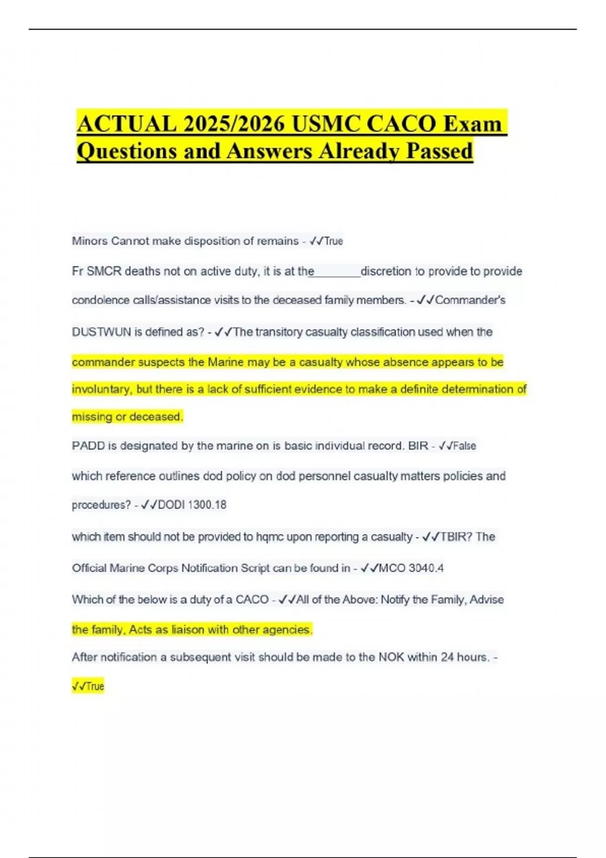 ACTUAL 2025/2026 USMC CACO Exam Questions and Answers Already Passed Minors Cannot make disposition of remains - ️️True Fr SMCR deaths not on active duty, it is at the discretion to provide to provide condolence calls/assistance visits to the deceased family members. - ️️Commander's DUSTWUN is defined as? - ️️The transitory casualty classification used when the commander suspects the Marine may be a casualty whose absence appears to be involuntary, but there is a lack of sufficient evidence to make a definite determination of missing or deceased.