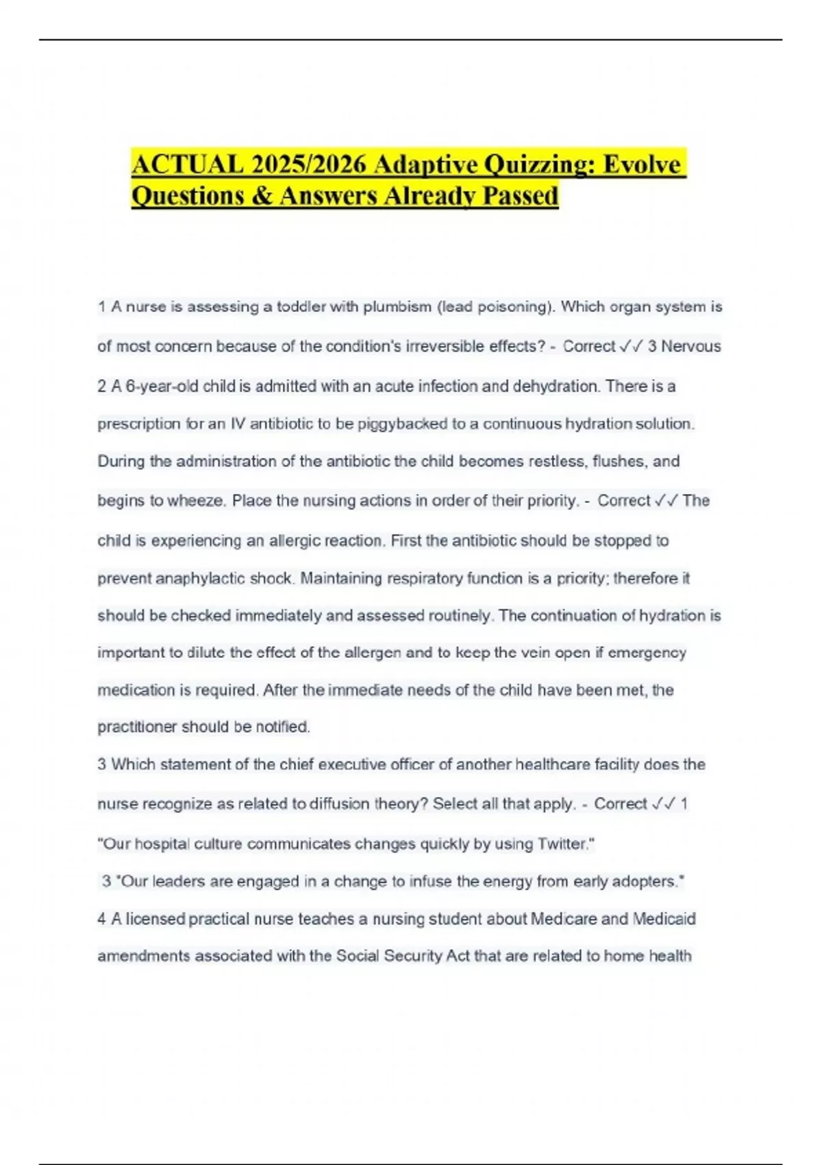 ACTUAL 2025/2026 Adaptive Quizzing: Evolve Questions & Answers Already Passed