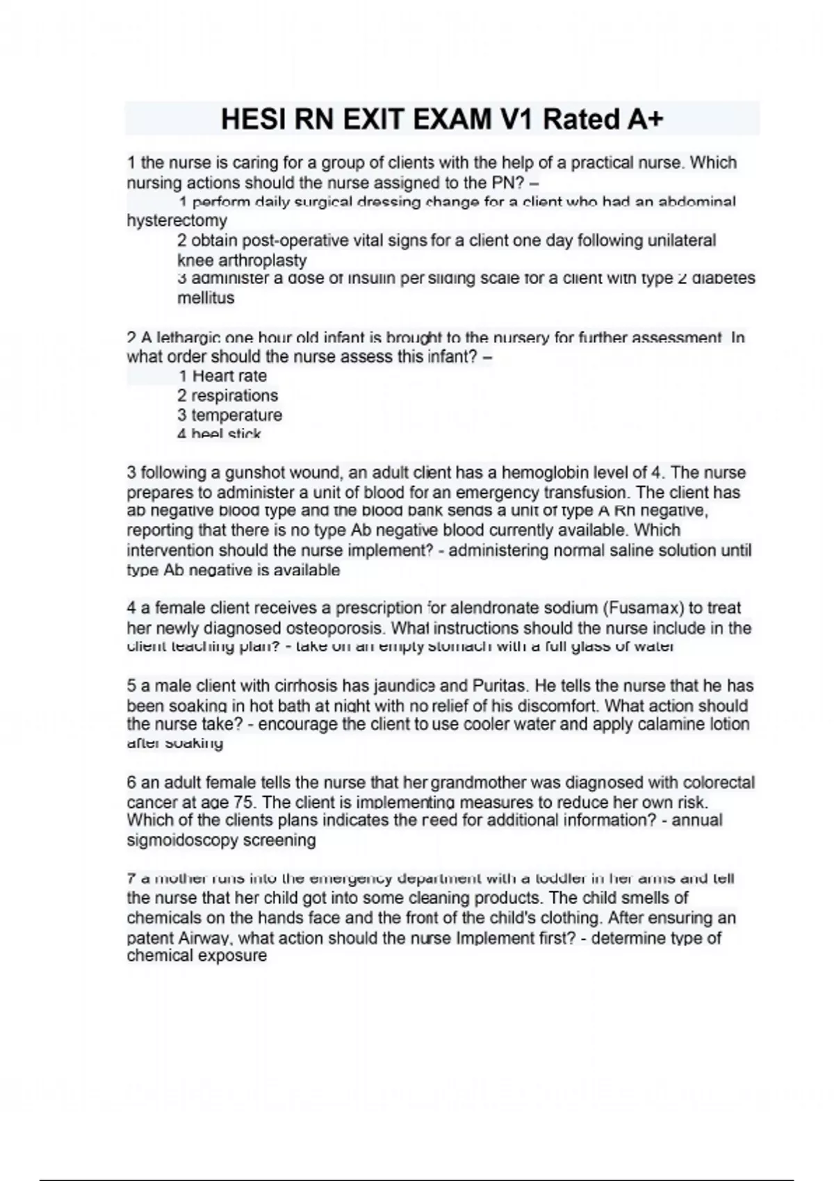 1 the nurse is caring for a group of clients with the help of a practical nurse. Which nursing actions should the nurse assigned to the PN? – 1 perform daily surgical dressing change for a client who had an abdominal hysterectomy 2 obtain post-operative vital signs for a client one day following unilateral knee arthroplasty 3 administer a dose of insulin per sliding scale for a client with type 2 diabetes mellitus 2 A lethargic one hour old infant is brought to the nursery for further assessment. In what order should the nurse assess this infant? – 1 Heart rate 2 respirations 3 temperature 4 heel stick 3 following a gunshot wound, an adult client has a hemoglobin level of 4. The nurse prepares to administer a unit of blood for an emergency transfusion. The client has ab negative blood type and the blood bank sends a unit of type A Rh negative, reporting that there is no type Ab negative blood currently available. Which intervention should the nurse implement? - administering normal saline solution until type Ab negative is available 4 a female client receives a prescription for alendronate sodium (Fusamax) to treat her newly diagnosed osteoporosis. What instructions should the nurse include in the client teaching plan? - take on an empty stomach with a full glass of water 5 a male client with cirrhosis has jaundice and Puritas. He tells the nurse that he has been soaking in hot bath at night with no relief of his discomfort. What action should the nurse take? - encourage the client to use cooler water and apply calamine lotion after soaking 6 an adult female tells the nurse that her grandmother was diagnosed with colorectal cancer at age 75. The client is implementing measures to reduce her own risk. Which of the clients plans indicates the need for additional information? - annual sigmoidoscopy screening 7 a mother runs into the emergency department with a toddler in her arms and tell the nurse that her child got into some cleaning products. The child smells of chemicals on the hands face and the front of the child's clothing. After ensuring an patent Airway, what action should the nurse Implement first? - determine type of chemical exposure 8 the nurse enters the room of a client with Parkinson's disease who is taking levodopa. The client is a rising slowly from the chair while the UAP stands next to the chair. What action should the nurse take? - a firm that the client should arrive slowly from the chair 9 a middle-aged female client tells the clinic nurse that she has lost an inch of height in the last year. What is the priority nursing intervention? - assist the client to schedule a bone density exam 10 an atypical antipsychotic, ziprasidone, is prescribed for a client with a diagnosis of schizophrenia. After the client has been taking the medication for two weeks, the nurse assesses the Drug's effectiveness. which client reports suggest that the medication is helpful? - hears voices less often 11 prior to obtaining a trapeze bar for a client with limited Mobility, which client assessment is most important for the nurse to obtain? - upper body muscle strength 12 a male client with heart failure reports heart palpitations and difficulty breathing when lying flat. When he requests additional pillows, the nurse determines that his heart rate is 125 beats per minute and respiratory rate is 22 breaths per minute. Which intervention is most important for the nurse to implement? - obtain manual blood pressure 13 a family member reports that the client who is bedridden has not been turned or repositioned all night and is sleeping on a special air mattress with no sheets. What information should the nurse provide to the family member? - clarify that an aerated support surface does not use sheets that often cause skin breakdown 14 an S3 heart sound is auscultated in a client in her third trimester of pregnancy. What intervention should the nurse take? - document in the client's record 15 the nurse is evaluating the diet teaching of a client with hypertension. What dinners selection indicates that the client understands the dietary recommendations for hypertension? - baked pork chop, apple sauce, corn on the cob, 1% milk, and key lime pie 16 a client who had a percutaneous coronary intervention two weeks ago returns to the clinic for a follow-up visit. The client had a post-operative ejection fraction of 30%. Today the client has lungs which are clear, slight pedal edema, and a 5 pound weight gain. Which interventions should the nurse implement? - assess compliance with routine prescriptions 17 the nurse is completing an admission assessment for a male client with paranoid schizophrenia. The client tells the nurse that the staff dislikes him. What action should the nurse take? - determine if the client has formulated any plans regarding the staff 18 an adult male was diagnosed with stage 4 lung cancer three weeks ago. His wife approaches the nurse and asks how she will know that her husband's death is imminent because their two adult children want to be there when he dies. What is the best response by the nurse? - explain that the client will start to lose consciousness and his body systems will slow down 19 a client with a history of adrenal insufficiency is admitted to the ICU with an acute adrenal crisis. the client is complaining of nausea and joint pain. Vital signs are temperature 102, heart rate 138, BP 80 / 60. which intervention should the nurse Implement first? - Infuse an intravenous fluid bolus 20 following morning care, a client with a C5 spinal cord injury who is sitting in a wheelchair becomes flushed and complains of a headache. Which intervention should the nurse Implement first? - relieve any kinks or obstruction in the clients Foley tubing 21 when caring for a client with a traumatic brain injury who had a craniotomy for increased intracranial pressure, the nurse assesses the client using the Glasgow Coma Scale every 2 hours. For the past 8 hours the clients g c s score 