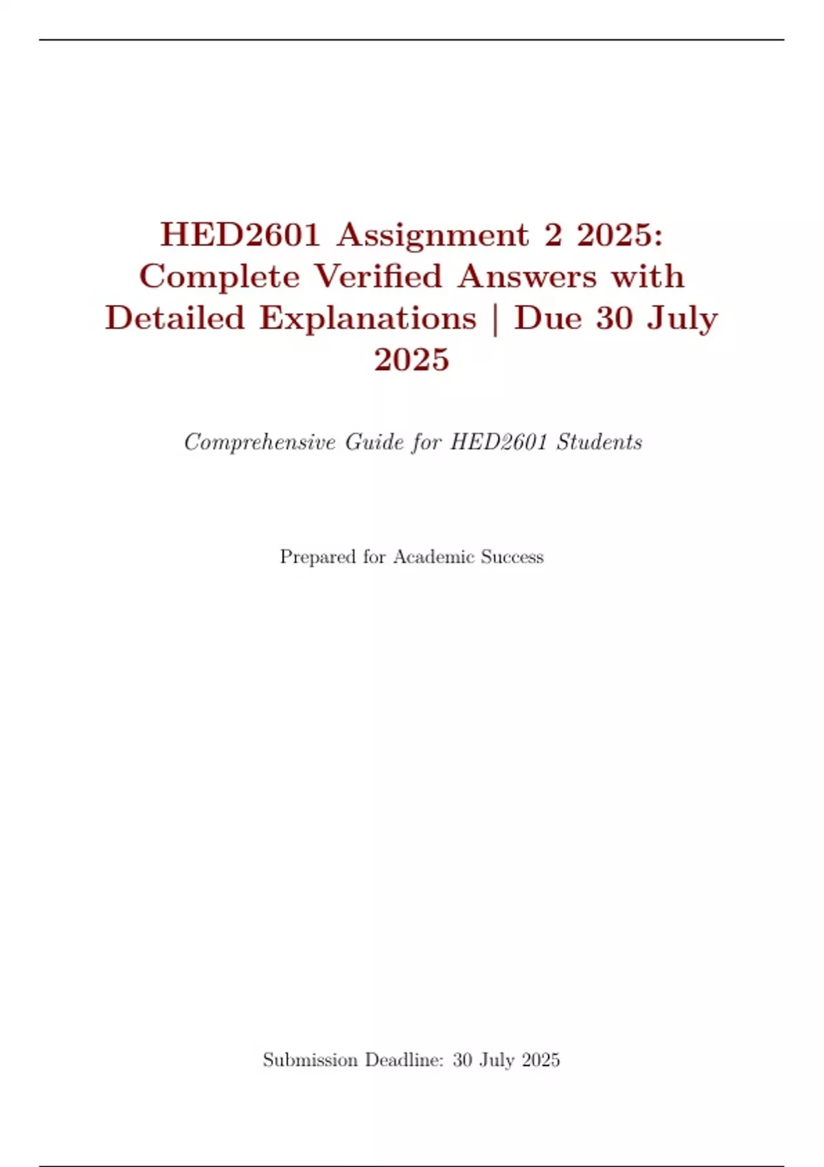 HED2601 Assignment 2 2025: Complete Verified Answers with Detailed Explanations | Due 30 July 2025 Comprehensive Guide for HED2601 Students Prepared for Academic Success Introduction This document provides a comprehensive set of 100 questions and answers for the HED2601 Assignment 2, due on 30 July 2025. The content focuses on early childhood education (ECE) principles, tailored for the HED2601 module. Each question is accompanied by a detailed, clear, and concise explanation to ensure a thorough understanding, avoiding unnecessary jargon. The use of dark royal black for headings enhances readability and professionalism