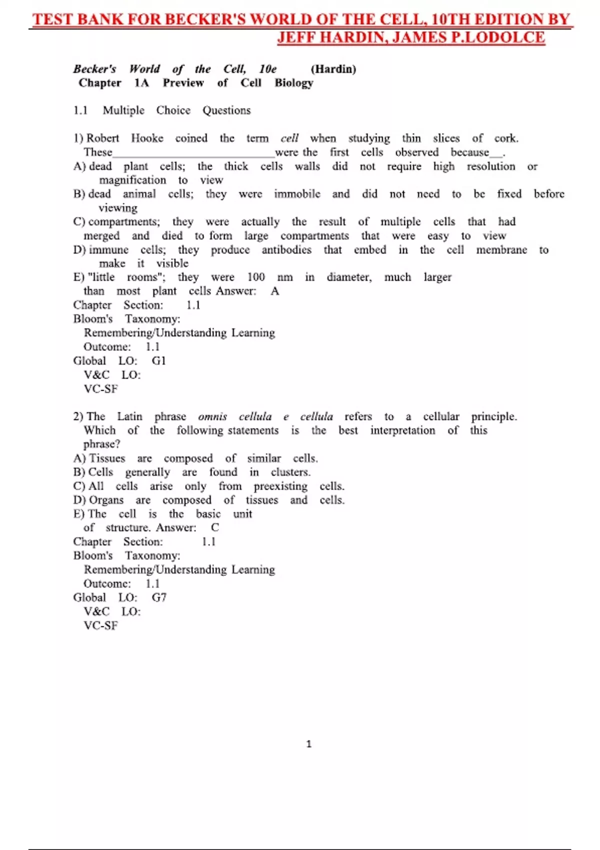 Test Bank - Becker's World of the Cell, 10th Edition (Hardin, 2025) Chapter 1-26 LATEST.