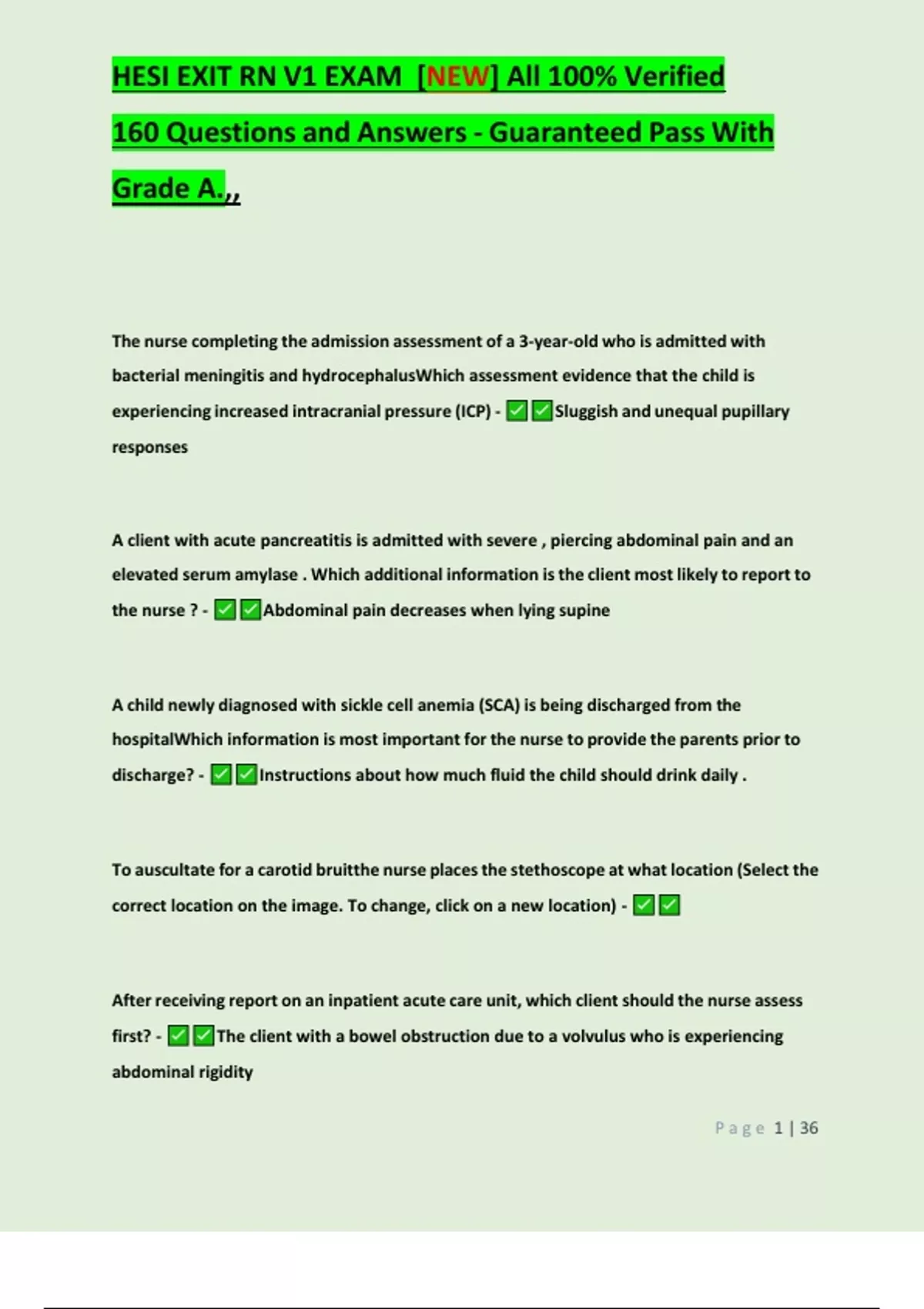 This document includes all 160 up-to-date and verified questions and answers from the HESI RN Exit Exam Version 1. Each question is written in exam format with correct answers and rationales, covering critical NCLEX-RN topics such as pharmacology, med-surg, mental health, maternal-newborn care, pediatrics, and priority-setting in nursing. Designed for maximum exam success, this resource reflects the most recent HESI V1 exam updates and is ideal for final prep before graduation or licensure.