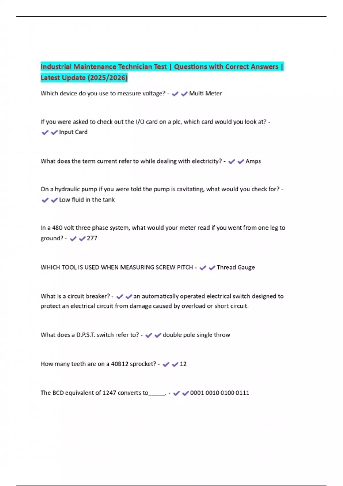 Industrial Maintenance Technician Test | Questions with Correct Answers | Latest Update (2025/2026)