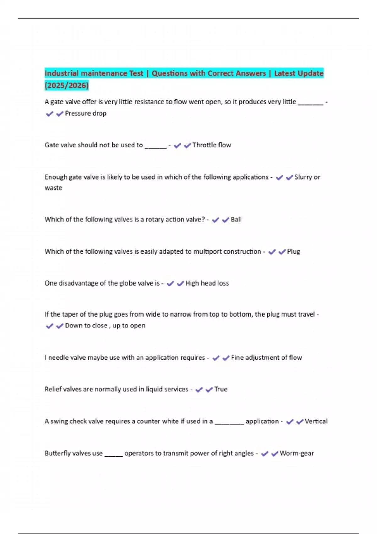 Industrial maintenance Test | Questions with Correct Answers | Latest Update (2025/2026)