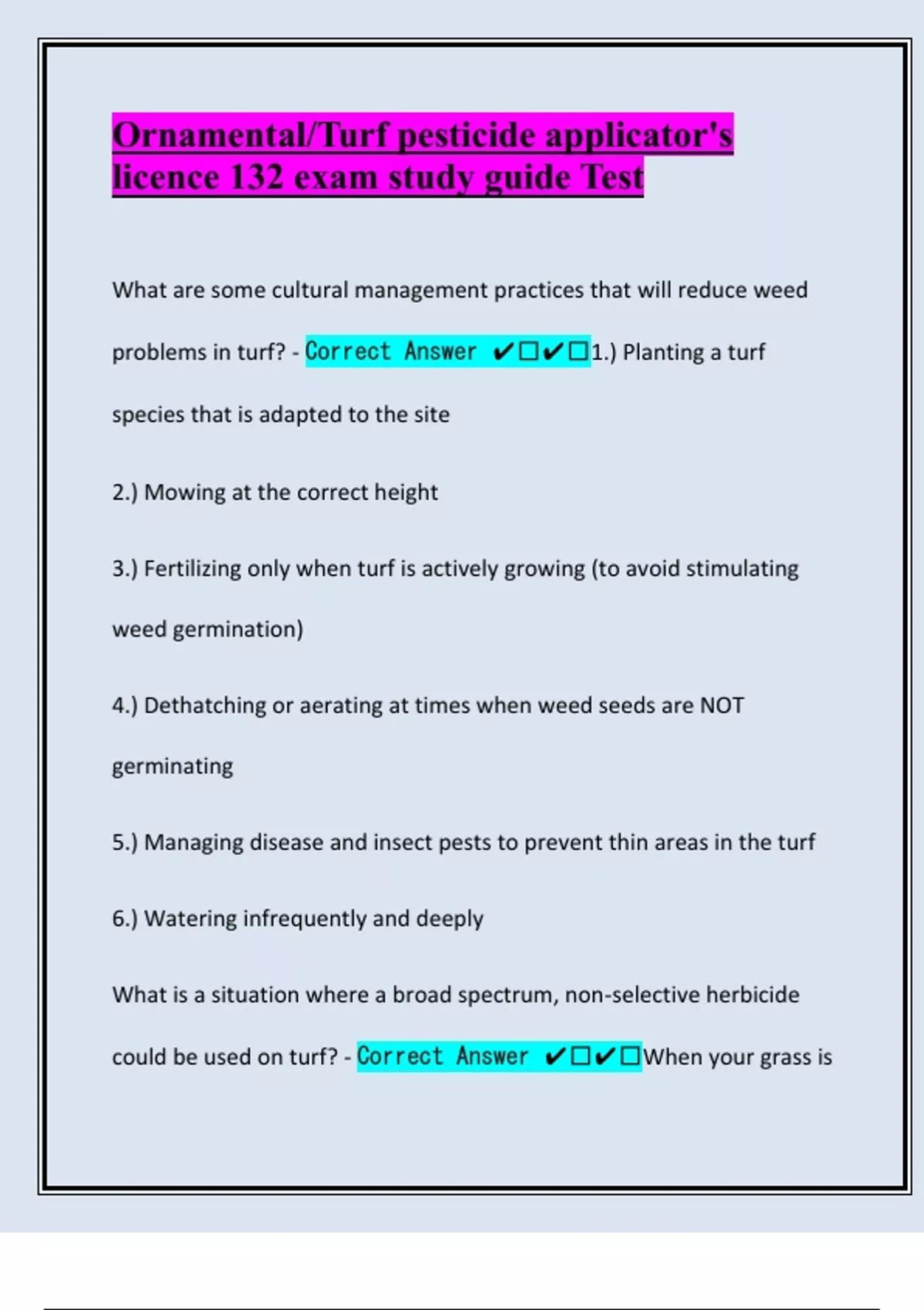 What are some cultural management practices that will reduce weed problems in turf? - Correct Answer ️️1.) Planting a turf species that is adapted to the site 2.) Mowing at the correct height 3.) Fertilizing only when turf is actively growing (to avoid stimulating weed germination) 4.) Dethatching or aerating at times when weed seeds are NOT germinating 5.) Managing disease and insect pests to prevent thin areas in the turf 6.) Watering infrequently and deeply What is a situation where a broad spectrum, non-selective herbicide could be used on turf? - Correct Answer ️️When your grass isbasically all weeds or you are trying to kill the dead grass to put new sod
