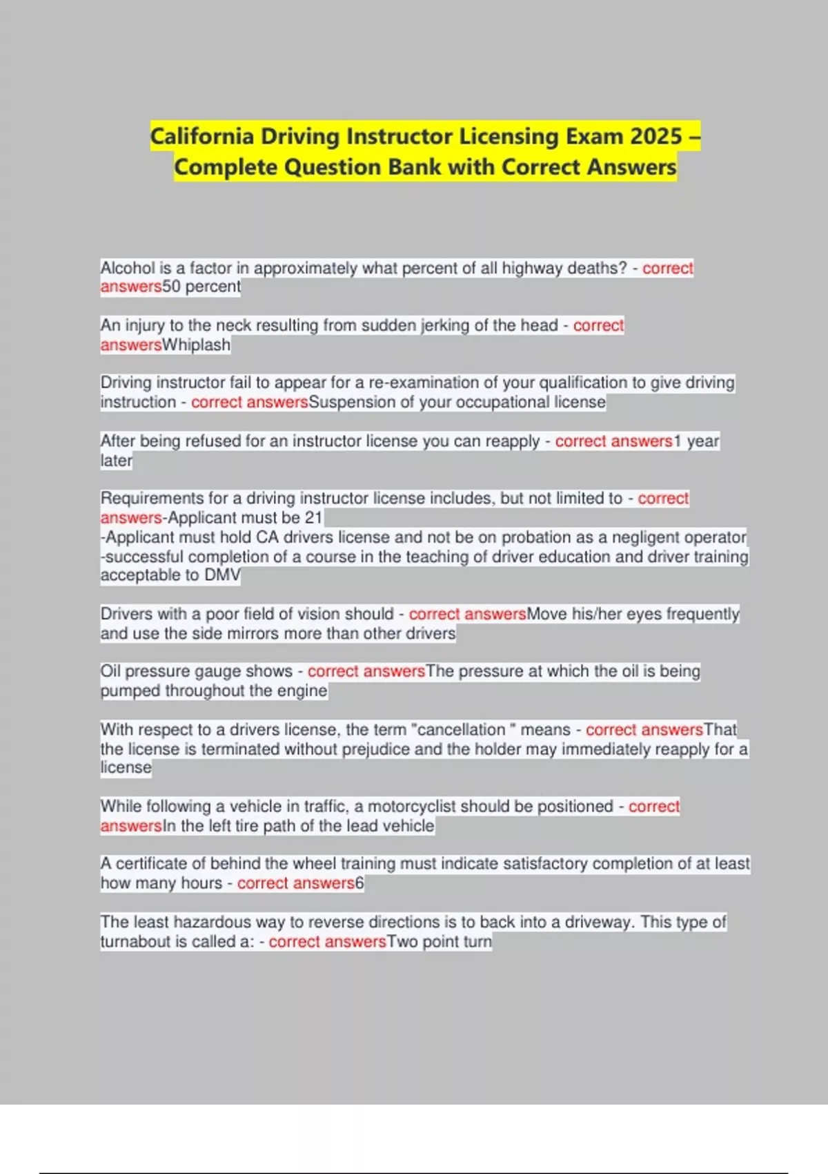 California Driving Instructor Licensing Exam 2025 – Complete Question Bank with Correct Answers