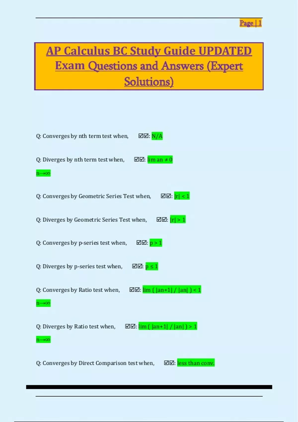 Q: Converges by nth term test when, 🗹🗹: N/A