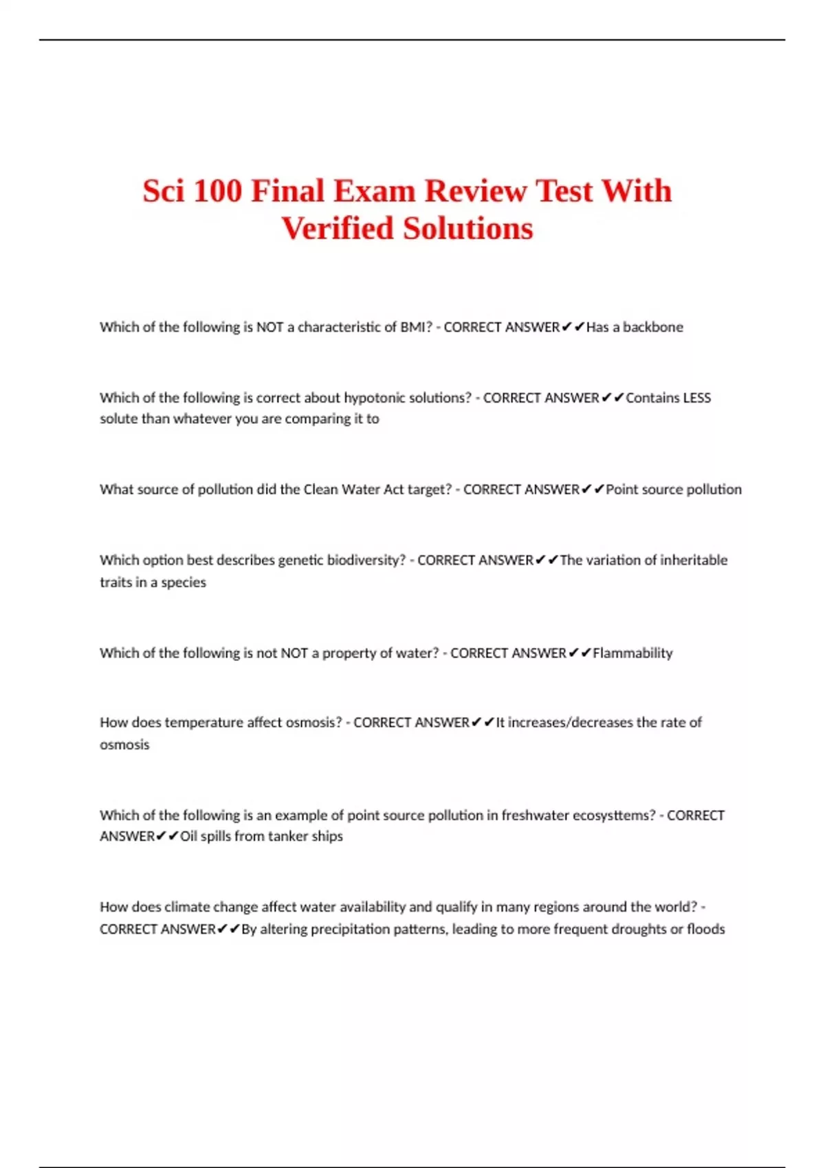 Which of the following is not NOT a property of water? - CORRECT ANSWER✔✔Flammability