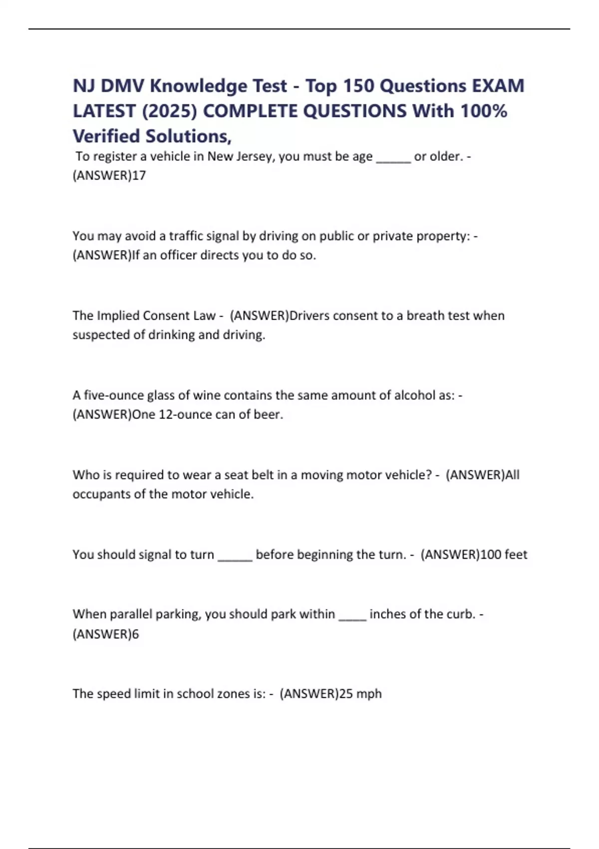 NJ DMV Knowledge Test - Top 150 Questions EXAM