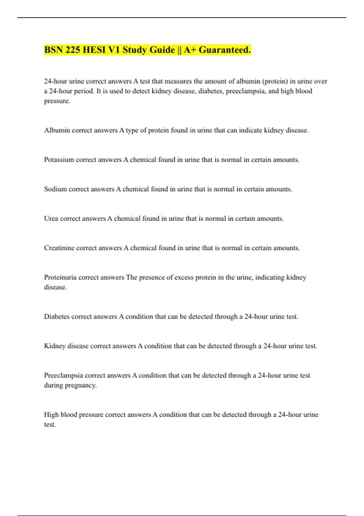 High blood pressure correct answers A condition that can be detected through a 24-hour urine