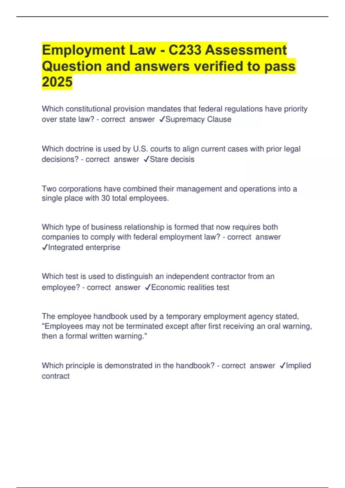 WGU Employment Law - C233 Study Guide Questions with complete solution 2025