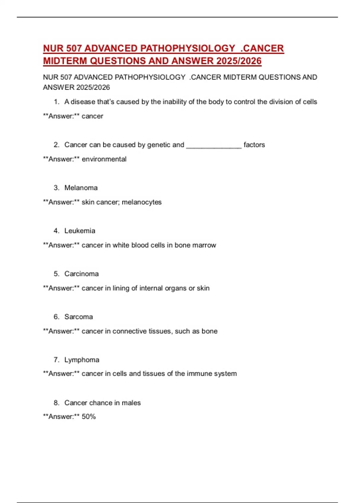 NUR 507 ADVANCED PATHOPHYSIOLOGY .CANCER MIDTERM QUESTIONS AND