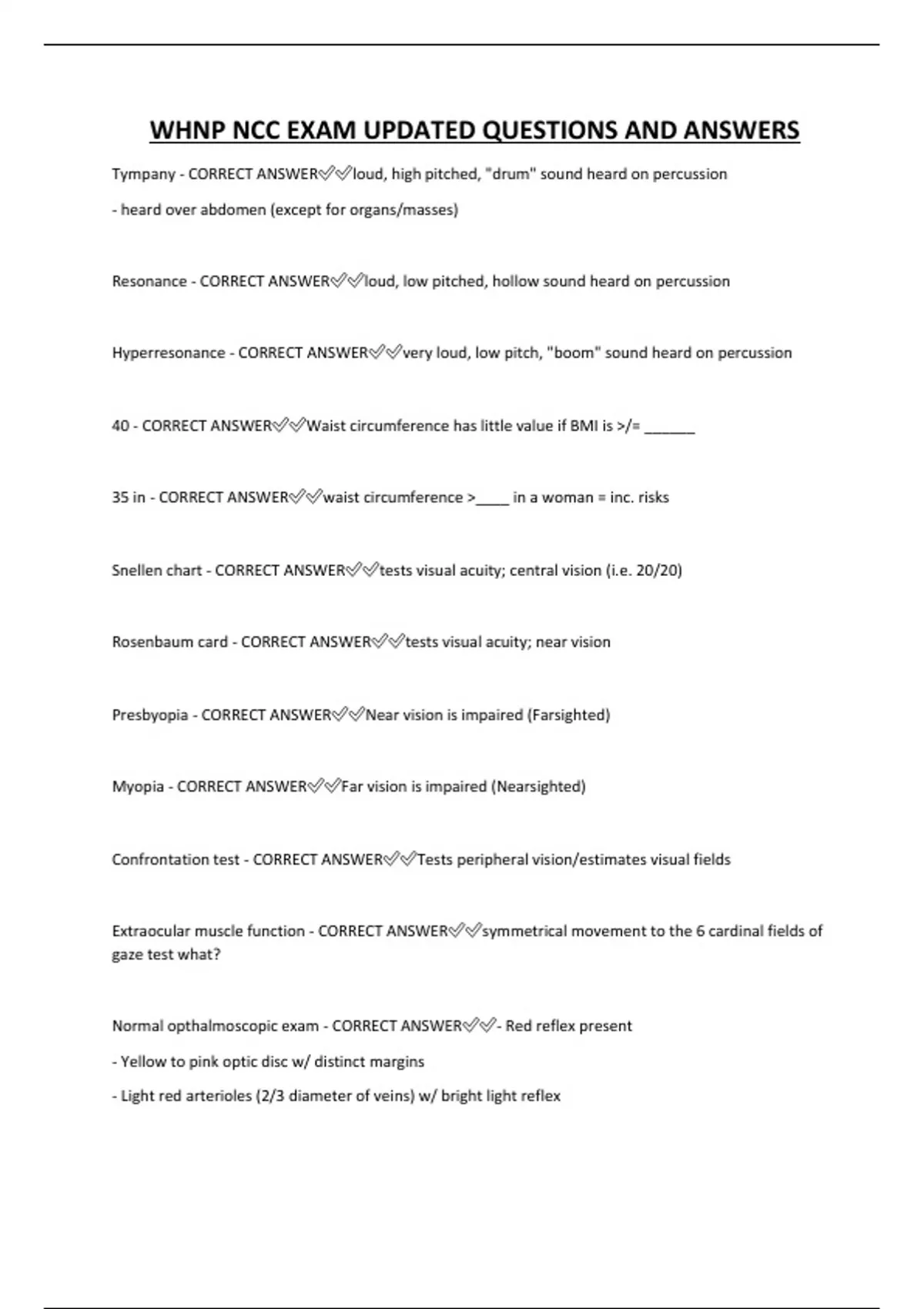 WHNP NCC EXAM UPDATED QUESTIONS AND ANSWERS Tympany - CORRECT ANSWERloud, high pitched, "drum" sound heard on percussion - heard over abdomen (except for organs/masses)