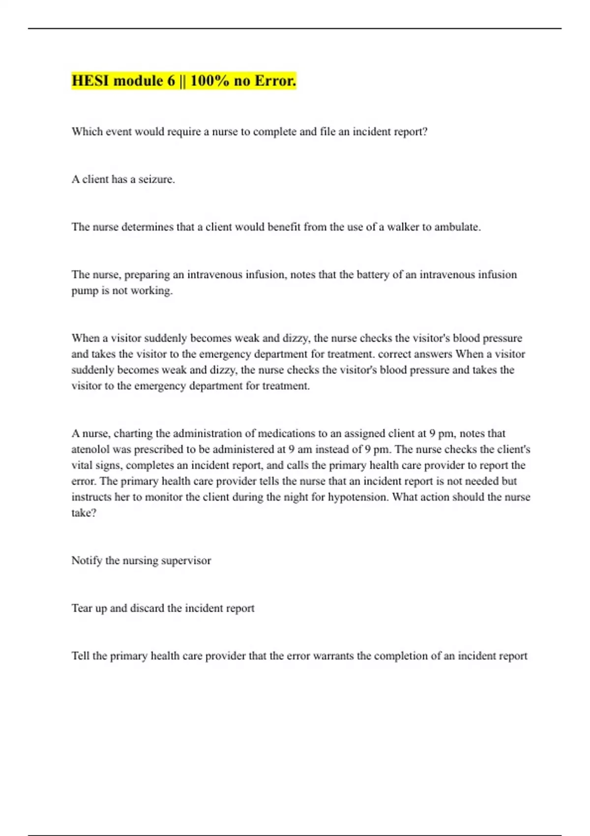 Which event would require a nurse to complete and file an incident report? A client has a seizure. The nurse determines that a client would benefit from the use of a walker to ambulate. The nurse, preparing an intravenous infusion, notes that the battery of an intravenous infusion pump is not working. When a visitor suddenly becomes weak and dizzy, the nurse checks the visitor's blood pressure and takes the visitor to the emergency department for treatment. correct answers When a visitor suddenly becomes weak and dizzy, the nurse checks the visitor's blood pressure and takes the visitor to the emergency department for treatment. A nurse, charting the administration of medications to an assigned client at 9 pm, notes that atenolol was prescribed to be administered at 9 am instead of 9 pm. The nurse checks the client's vital signs, completes an incident report, and calls the primary health care provider to report the error. The primary health care provider tells the nurse that an incident report is not needed but instructs her to monitor the client during the night for hypotension. What action should the nurse take? Notify the nursing supervisor Tear up and discard the incident report Tell the primary health care provider that the error warrants the completion of an incident report
