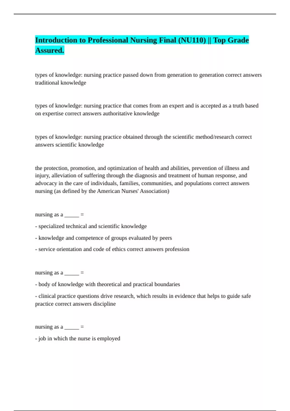 Introduction to Professional Nursing Final (NU110) || Top Grade Assured.