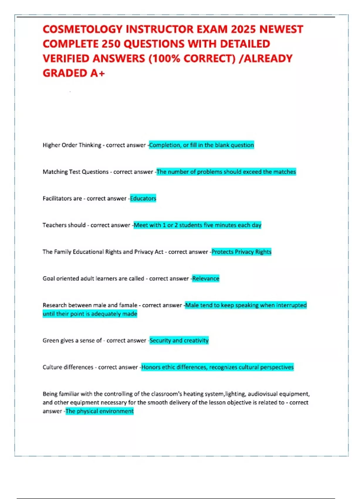 COSMETOLOGY INSTRUCTOR EXAM 2025 LATEST COMPLETE 250 QUESTIONS WITH DETAILED VERIFIED ANSWERS (100% ACCURATE) ALREADY GRADED A+COSMETOLOGY INSTRUCTOR EXAM 2025 LATEST COMPLETE 250 QUESTIONS WITH DETAILED VERIFIED ANSWERS (100% ACCURATE) ALREADY GRADED A+COSMETOLOGY INSTRUCTOR EXAM 2025 LATEST COMPLETE 250 QUESTIONS WITH DETAILED VERIFIED ANSWERS (100% ACCURATE) ALREADY GRADED A+COSMETOLOGY INSTRUCTOR EXAM 2025 LATEST COMPLETE 250 QUESTIONS WITH DETAILED VERIFIED ANSWERS (100% ACCURATE) ALREADY GRADED A+COSMETOLOGY INSTRUCTOR EXAM 2025 LATEST COMPLETE 250 QUESTIONS WITH DETAILED VERIFIED ANSWERS (100% ACCURATE) ALREADY GRADED A+COSMETOLOGY INSTRUCTOR EXAM 2025 LATEST COMPLETE 250 QUESTIONS WITH DETAILED VERIFIED ANSWERS (100% ACCURATE) ALREADY GRADED A+