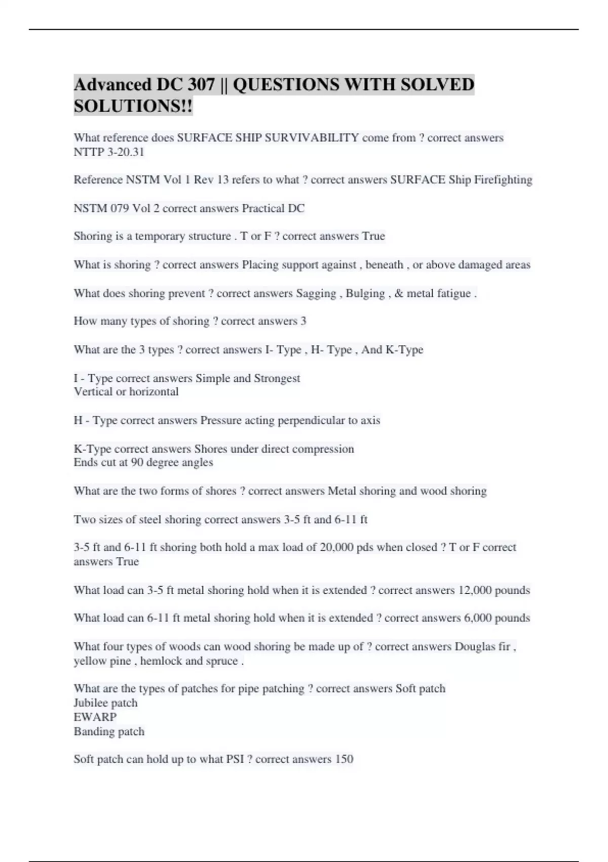K-Type correct answers Shores under direct compression