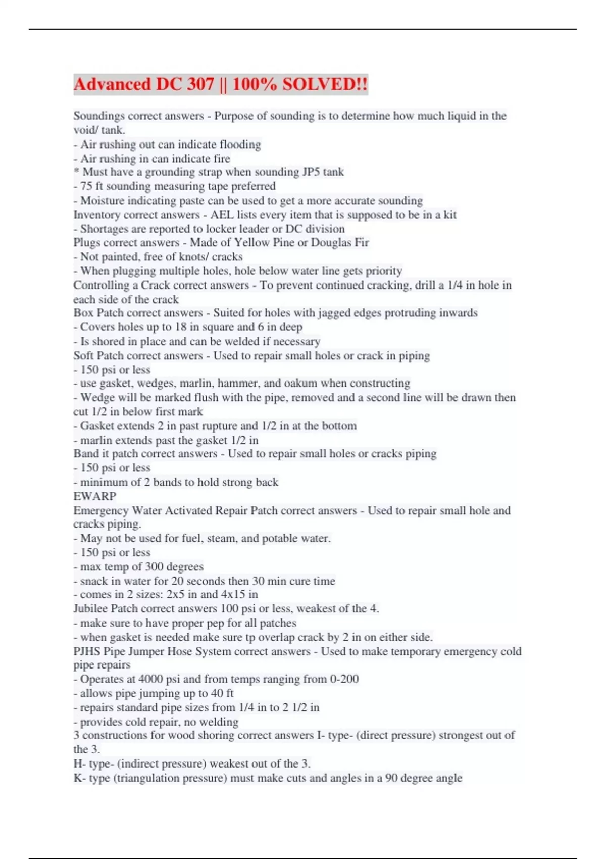 Soundings correct answers - Purpose of sounding is to determine how much liquid in the void/ tank. - Air rushing out can indicate flooding - Air rushing in can indicate fire * Must have a grounding strap when sounding JP5 tank - 75 ft sounding measuring tape preferred - Moisture indicating paste can be used to get a more accurate sounding Inventory correct answers - AEL lists every item that is supposed to be in a kit - Shortages are reported to locker leader or DC division Plugs correct answers - Made of Yellow Pine or Douglas Fir - Not painted, free of knots/ cracks - When plugging multiple holes, hole below water line gets priority Controlling a Crack correct answers - To prevent continued cracking, drill a 1/4 in hole in each side of the crack Box Patch correct answers - Suited for holes with jagged edges protruding inwards - Covers holes up to 18 in square and 6 in deep - Is shored in place and can be welded if necessary Soft Patch correct answers - Used to repair small holes or crack in piping - 150 psi or less - use gasket, wedges, marlin, hammer, and oakum when constructing - Wedge will be marked flush with the pipe, removed and a second line will be drawn then cut 1/2 in below first mark - Gasket extends 2 in past rupture and 1/2 in at the bottom - marlin extends past the gasket 1/2 in Band it patch correct answers - Used to repair small holes or cracks piping - 150 psi or less - minimum of 2 bands to hold strong back EWARP Emergency Water Activated Repair Patch correct answers - Used to repair small hole and cracks piping. - May not be used for fuel, steam, and potable water. - 150 psi or less - max temp of 300 degrees - snack in water for 20 seconds then 30 min cure time - comes in 2 sizes: 2x5 in and 4x15 in Jubilee Patch correct answers 100 psi or less, weakest of the 4. - make sure to have proper pep for all patches - when gasket is needed make sure tp overlap crack by 2 in on either side. PJHS Pipe Jumper Hose System correct answers - Used to make temporary emergency cold pipe repairs - Operates at 4000 psi and from temps ranging from 0-200 - allows pipe jumping up to 40 ft - repairs standard pipe sizes from 1/4 in to 2 1/2 in - provides cold repair, no welding 3 constructions for wood shoring correct answers I- type- (direct pressure) strongest out of the 3. H- type- (indirect pressure) weakest out of the 3. K- type (triangulation pressure) must make cuts and angles in a 90 degree angle