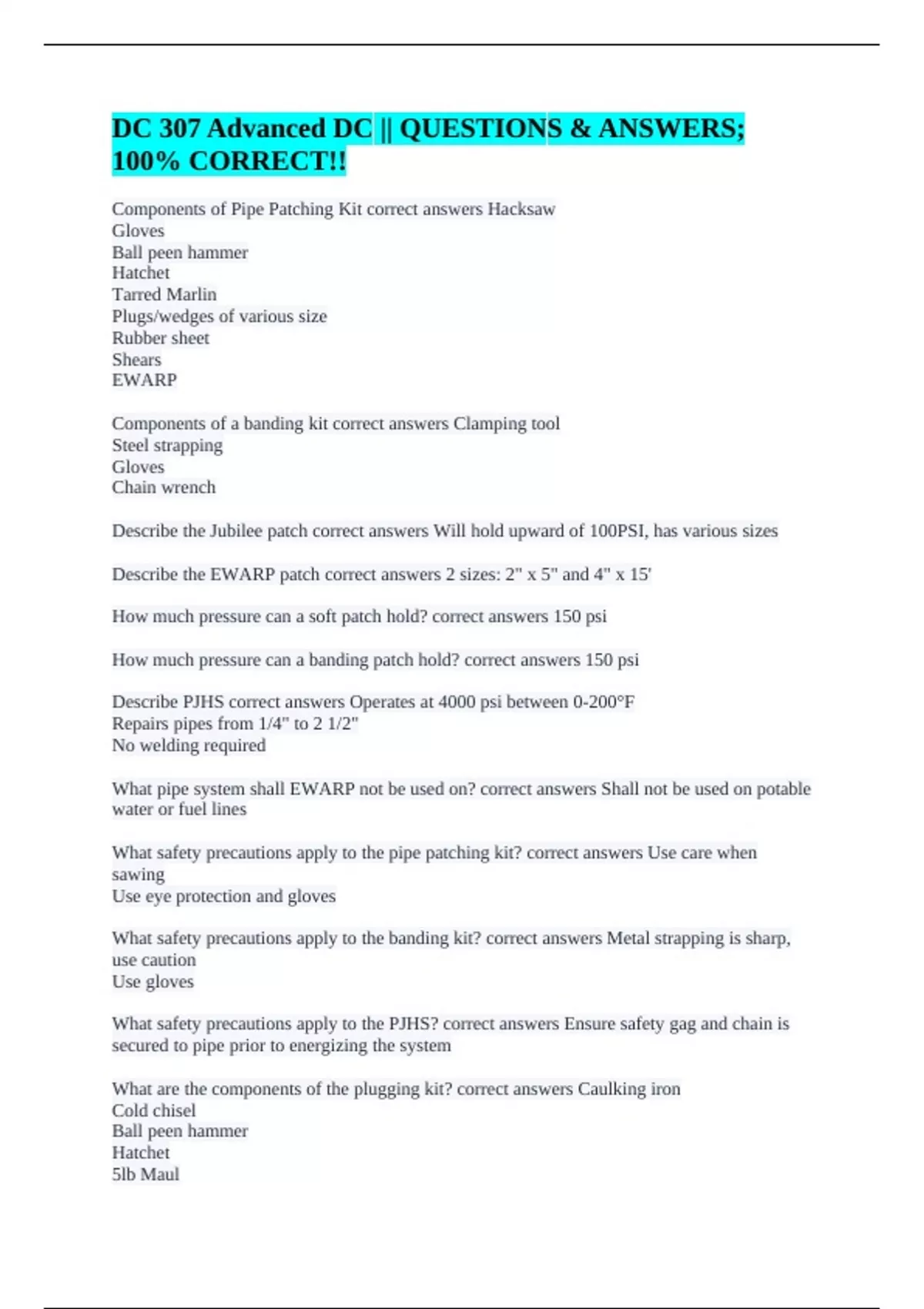 Components of Pipe Patching Kit correct answers Hacksaw Gloves Ball peen hammer Hatchet Tarred Marlin Plugs/wedges of various size Rubber sheet Shears EWARP Components of a banding kit correct answers Clamping tool Steel strapping Gloves Chain wrench Describe the Jubilee patch correct answers Will hold upward of 100PSI, has various sizes Describe the EWARP patch correct answers 2 sizes: 2" x 5" and 4" x 15' How much pressure can a soft patch hold? correct answers 150 psi How much pressure can a banding patch hold? correct answers 150 psi Describe PJHS correct answers Operates at 4000 psi between 0-200°F Repairs pipes from 1/4" to 2 1/2" No welding required What pipe system shall EWARP not be used on? correct answers Shall not be used on potable water or fuel lines What safety precautions apply to the pipe patching kit? correct answers Use care when sawing Use eye protection and gloves What safety precautions apply to the banding kit? correct answers Metal strapping is sharp, use caution Use gloves What safety precautions apply to the PJHS? correct answers Ensure safety gag and chain is secured to pipe prior to energizing the system What are the components of the plugging kit? correct answers Caulking iron Cold chisel Ball peen hammer Hatchet 5lb Maul