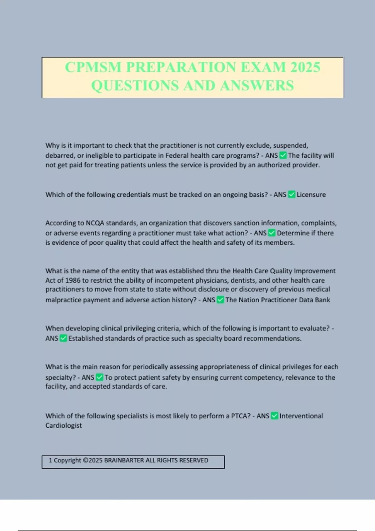 Why is it important to check that the practitioner is not currently exclude, suspended, debarred, or ineligible to participate in Federal health care programs? - ANS The facility will not get paid for treating patients unless the service is provided by an authorized provider. Which of the following credentials must be tracked on an ongoing basis? - ANS Licensure According to NCQA standards, an organization that discovers sanction information, complaints, or adverse events regarding a practitioner must take what action? - ANS Determine if there is evidence of poor quality that could affect the health and safety of its members. What is the name of the entity that was established thru the Health Care Quality Improvement Act of 1986 to restrict the ability of incompetent physicians, dentists, and other health care practitioners to move from state to state without disclosure or discovery of previous medical malpractice payment and adverse action history? - ANS The Nation Practitioner Data Bank When developing clinical privileging criteria, which of the following is important to evaluate? - ANS Established standards of practice such as specialty board recommendations. What is the main reason for periodically assessing appropriateness of clinical privileges for each specialty? - ANS To protect patient safety by ensuring current competency, relevance to the facility, and accepted standards of care. Which of the following specialists is most likely to perform a PTCA? - ANS Interventional Cardiologist CPMSM PREPARATION EXAM 2025 QUESTIONS AND ANSWERS 2 Copyright ©2025 BRAINBARTER ALL RIGHTS RESERVED The Joint Commission hospital standards require that clinical privileges are hospital specific and - ANS Based on the individual's demonstrated current competence and the procedures the hospital can support. Which of the following would be routinely performed by a cardiologist? - ANS Transesophageal Echocardiography Which NCQA required committee makes recommendations regarding credentialing decisions? - ANS Credentialing Committee HFAP standards require three medical staff committees to be delineated in the medical staff structure; what are they? - ANS Medical Executive Committee, the Utilization Review Committee and the Utilization of Osteopathic Methods and Concepts Committee If you needed to find out about what the federal government requires in regards to anti-trust issues, what law would you consult? - ANS The Sherman Anti-trust Act Peer references should be obtained from: - ANS Practitioners in the same professional discipline as the applicant. Patrick v. Burgett is an important case because it: - ANS Illustrates the potential for antitrust liability arising out of peer review activities. If a medical staff member has privileges and / or medical staff appointment revoked, he/she must be: - ANS Provided due process Access to credentials files should be: - ANS Described fully in an access policy Which of the following bodies approves clinical privileges? - ANS The Governing body / Board Which primary source verification is required by NCQA prior to provisional credentialing? - ANS Licensure and 5 ye