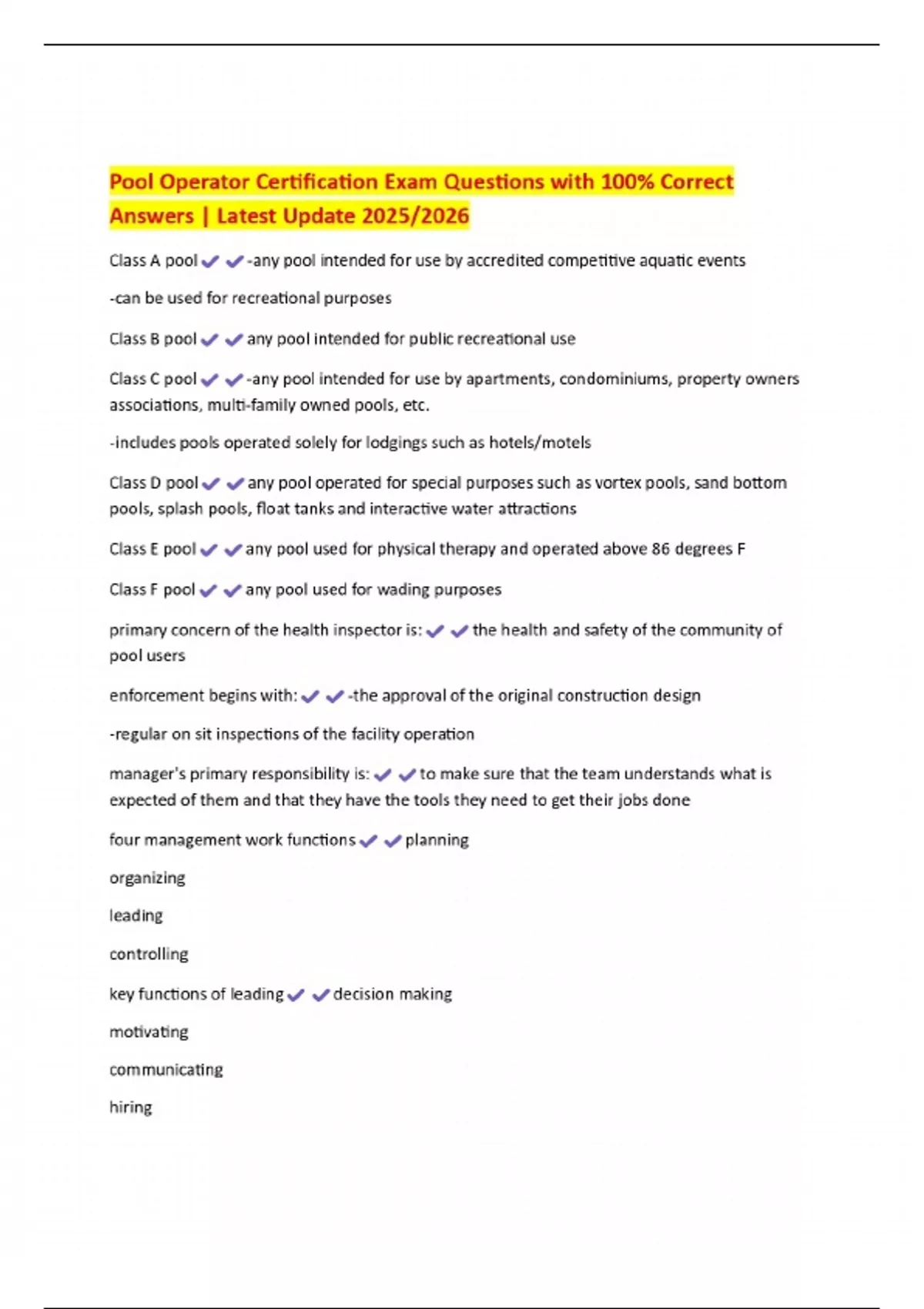 Pool Operator Certification Exam Questions with 100% Correct Answers | Latest Update 2025/2026