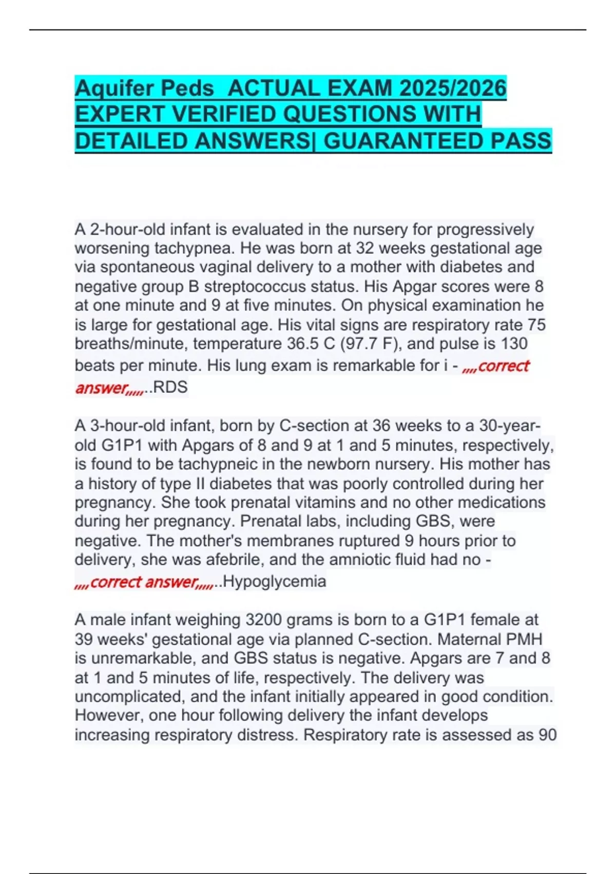 Aquifer Peds ACTUAL EXAM 2025/2026 EXPERT VERIFIED QUESTIONS WITH DETAILED ANSWERS| GUARANTEED PASS A 2-hour-old infant is evaluated in the nursery for progressively worsening tachypnea. He was born at 32 weeks gestational age via spontaneous vaginal delivery to a mother with diabetes and negative group B