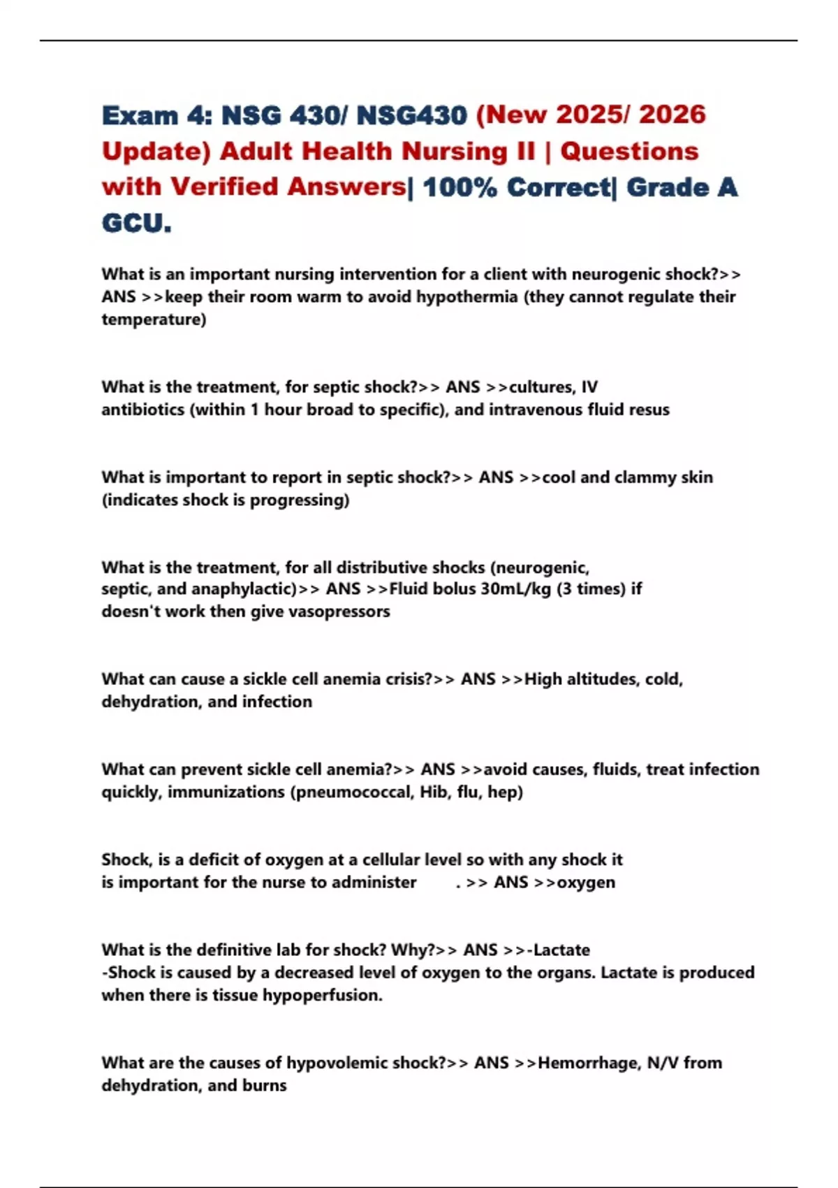 Exam 4: NSG 430/ NSG430 (New 2025/ 2026 Update) Adult Health Nursing II | Questions with Verified Answers| 100% Correct| Grade A GCU. What is an important nursing intervention for a client with neurogenic shock? ANS keep their room warm to avoid hypothermia (they cannot regulate their temperature) What is the treatment, for septic shock? ANS cultures, IV antibiotics (within 1 hour broad to specific), and intravenous fluid resus What is important to report in septic shock? ANS cool and clammy skin (indicates shock is progressing) What is the treatment, for all distributive shocks (neurogenic, septic, and anaphylactic) ANS Fluid bolus 30mL/kg (3 times) if doesn't work then give vasopressors What can cause a sickle cell anemia crisis? ANS High altitudes, cold, dehydration, and infection What can prevent sickle cell anemia? ANS avoid causes, fluids, treat infection quickly, immunizations (pneumococcal, Hib, flu, hep) Shock, is a deficit of oxygen at a cellular level so with any shock it is important for the nurse to administer . ANS oxygen What is the definitive lab for shock? Why? ANS -Lactate -Shock is caused by a decreased level of oxygen to the organs. Lactate is produced when there is tissue hypoperfusion. What are the causes of hypovolemic shock? ANS Hemorrhage, N/V from dehydration, and burns What are the signs and symptoms of hypovolemic shock? ANS - cool and clammy skin -hypotension -tachycardia What is cardiogenic shock? ANS A pumping failure of the heart What are the signs and symptoms of cardiogenic shock? ANS crackles, SOB (MONITOR RESPIRATORY), decreased UOP, LOC, and BP What medications are given for cardiogenic shock? ANS -Increase contractility (dopamine, dobutamine, digoxin) -Decrease afterload (diuretics to reduce preload/improve CO and dobutamine) -Improve perfusion (vasodilators such as nitroprusside: effective if skin is warm and pink) What are the signs and symptoms of neurogenic shock? ANS hypotension, bradycardia, and poikilothermia What are important nursing interventions for sickle cell anemia crisis? ANS O2, fluids/electrolytes, pain management (morphine), and hydroxyurea What can cause DIC? ANS bacterial septicemia What are nursing interventions for DIC? ANS -STABILIZE ABCs (O2, fluids, etc) -Treat cause -Give fresh frozen plasma Patient with septicemia develops bleeding at venipuncture site and blood in stools. What is the nurse’s priority? ANS NOTIFY HCP (suggests DIC) What is the S/S of a febrile, nonhemolytic blood transfusion reaction? ANS fever, chills, and headache What is a prevention measure of a febrile blood transfusion reaction? ANS acetaminophen or antihistamine 30 minutes prior to infusion What are the signs and symptoms of an acute hemolytic blood transfusion reaction? ANS fever, chills, Lower, BACK PAIN, HYPOTENSION, and hematuria What is the treatment, for an acute hemolytic blood transfusion reaction? ANS stop infusion, draw labs, UA, increase BP, and urinary Cath What is TACO? ANS transfusion associated circulatory overload (HF) What is the BNP level in TACO? ANS 1,000 What is the treatment for TACO? ANS O2, intubation, and diuresis What is TRALI? ANS transfusion related acute lung injury (caused by a reaction from donors WBC) What are the s/s of TRALI? ANS hypotension, occurs 6 hours after infusion, and dyspnea NO DIURETICS (given in TACO) What is the BNP in TRALI? ANS 250