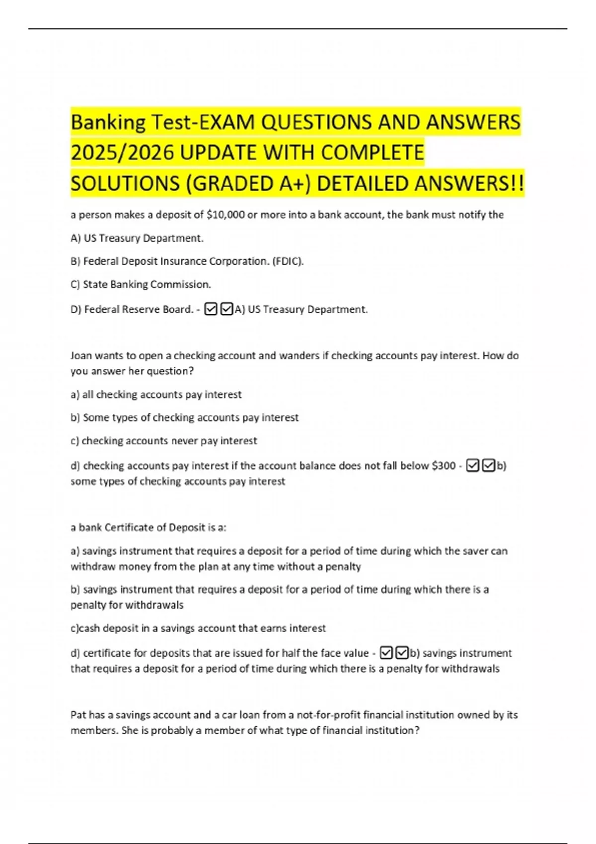 Banking Test-EXAM QUESTIONS AND ANSWERS 2025/2026 UPDATE WITH COMPLETE SOLUTIONS (GRADED A+) DETAILED ANSWERS!! a person makes a deposit of $10,000 or more into a bank account, the bank must notify the A) US Treasury Department. B) Federal Deposit Insurance Corporation. (FDIC). C) State Banking Commission. D) Federal Reserve Board. - A) US Treasury Department. Joan wants to open a checking account and wanders if checking accounts pay interest. How do you answer her question? a) all checking accounts pay interest b) Some types of checking accounts pay interest c) checking accounts never pay interest d) checking accounts pay interest if the account balance does not fall below $300 - b) some types of checking accounts pay interest