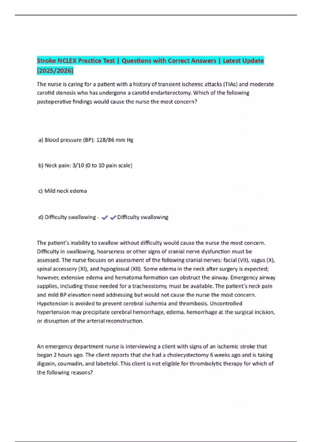 Stroke NCLEX Practice Test | Questions with Correct Answers | Latest Update (2025/2026)