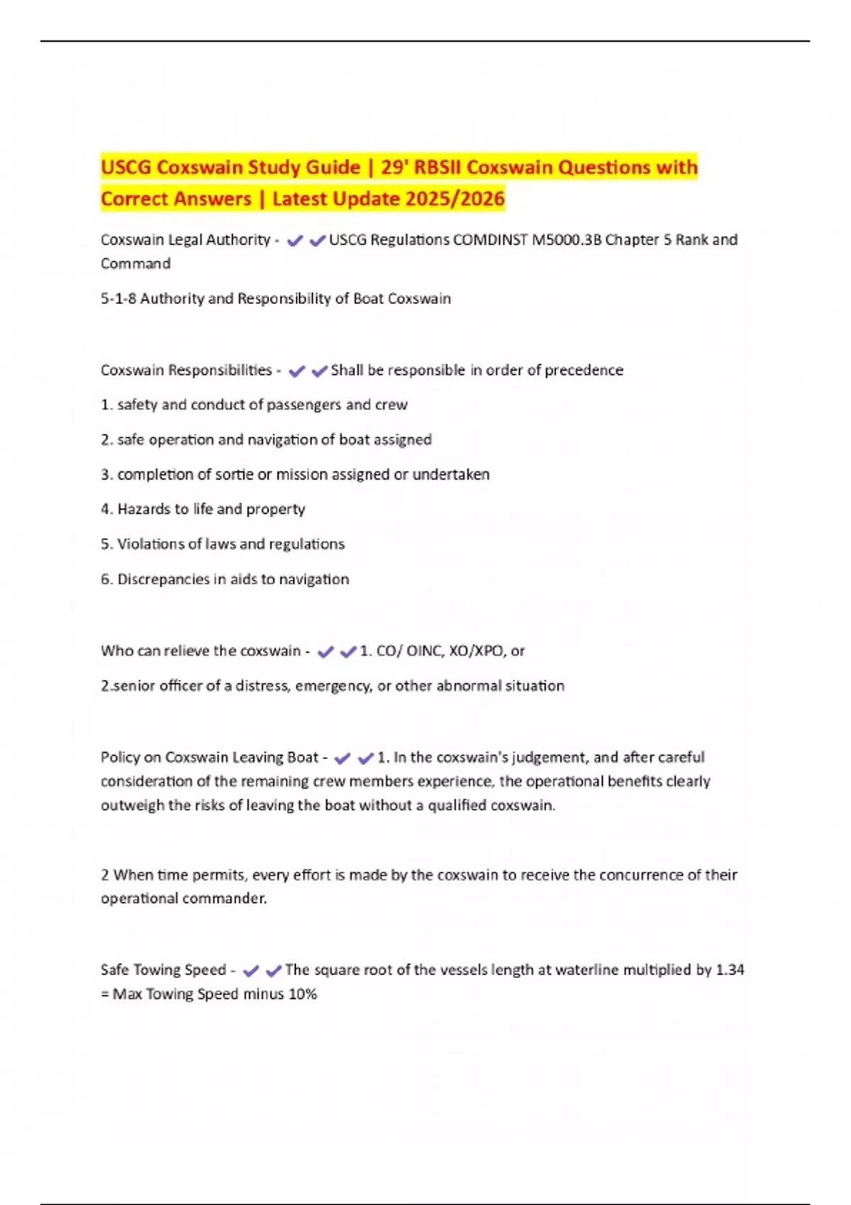 USCG Coxswain Study Guide | 29' RBSII Coxswain Questions with Correct Answers | Latest Update 2025/2026