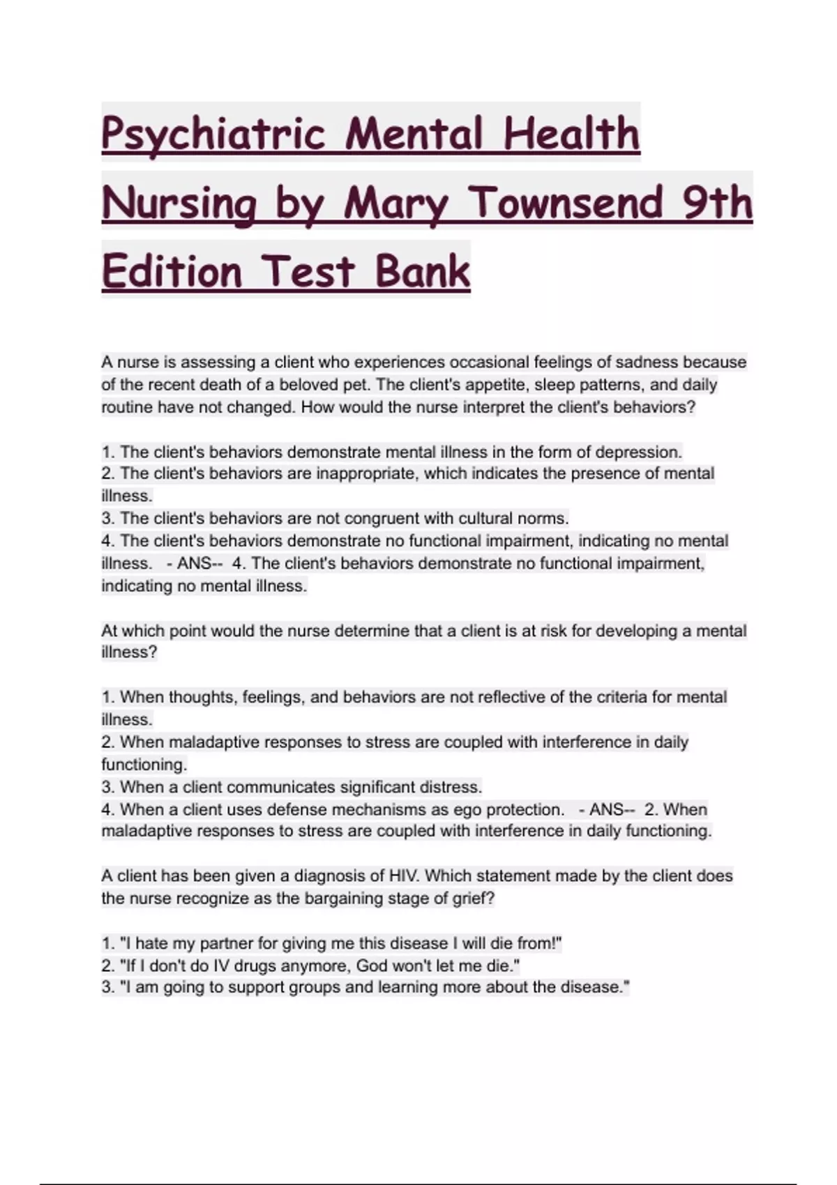 A nurse is assessing a client who experiences occasional feelings of sadness because of the recent death of a beloved pet. The client's appetite, sleep patterns, and daily routine have not changed. How would the nurse interpret the client's behaviors? 1. The client's behaviors demonstrate mental illness in the form of depression. 2. The client's behaviors are inappropriate, which indicates the presence of mental illness. 3. The client's behaviors are not congruent with cultural norms. 4. The client's behaviors demonstrate no functional impairment, indicating no mental illness. - ANS-- 4. The client's behaviors demonstrate no functional impairment, indicating no mental illness. At which point would the nurse determine that a client is at risk for developing a mental illness? 1. When thoughts, feelings, and behaviors are not reflective of the criteria for mental illness. 2. When maladaptive responses to stress are coupled with interference in daily functioning. 3. When a client communicates significant distress. 4. When a client uses defense mechanisms as ego protection. - ANS-- 2. When maladaptive responses to stress are coupled with interference in daily functioning. A client has been given a diagnosis of HIV. Which statement made by the client does the nurse recognize as the bargaining stage of grief? 1. "I hate my partner for giving me this disease I will die from!" 2. "If I don't do IV drugs anymore, God won't let me die." 3. "I am going to support groups and learning more about the disease." 4. "Can you please re-draw the test results; I think they may be wrong?" - ANS-- 2. "If I don't do IV drugs anymore, God won't let me die." A nurse notes that a client is extremely withdrawn, delusional, and emotionally exhausted. The nurse assesses the client's anxiety as which level? 1. Mild anxiety 2. Moderate anxiety 3. Severe anxiety 4. Panic anxiety - ANS-- 4. Panic anxiety A psychiatric nurse intern states, "This client's use of defense mechanisms should be eliminated." Which is a correct evaluation of this nurse's statement? 1. Defense mechanisms can be appropriate responses to stress and need not be eliminated. 2. Defense mechanisms are a maladaptive attempt of the ego to manage anxiety and should always be eliminated. 3. Defense mechanisms, used by individuals with weak ego integrity, should be discouraged and not completely eliminated. 4. Defense mechanisms cause disintegration of the ego and should be fostered and encouraged. - ANS-- 1. Defense mechanisms can be appropriate responses to stress and need not be eliminated. During an intake assessment, a nurse asks both physiological and psychosocial questions. The client angrily responds, "I'm here for my heart, not my head problems." Which is the nurse's best response? 1. "It is just a routine part of our assessment. All clients are asked these same questions." 2. "Why are you concerned about these types of questions?" 3. "Psychological factors, like excessive stress, have been found to affect medical conditions." 4. "We can skip these questions, if you like. It isn't imperative that we complete this section." - ANS-- 3. "Psychological factors, like excessive stress, have been found to affect medical conditions." A client who is being treated for chronic kidney disease complains to the health-care provider that he does not like the food available to him while hospitalized. The health-care provider insists that the client strictly adhere to the diet plan. What action can be expected if the client uses the defense mechanism of displacement? 1. The client assertively confronts the health-care provider. 2. The client insists on being discharged and goes for a long, brisk walk. 3. The client snaps at the nurse and criticizes the nursing care provided. 4. The client hides his anger by explaining the logical reasoning for the diet to his spouse. - ANS-- 3. The client snaps at the nurse and criticizes the nursing care provided. A fourth-grade boy teases and makes jokes about a cute girl in his class. A nurse would recognize this behavior as indicative of which defense mechanism? 1. Displacement 2. Projection 3. Reaction formation 4. Sublimation - ANS-- 3. Reaction formation Which nursing statement regarding the concept of psychosis is most accurate? 1. Individuals experiencing psychoses are aware that their behaviors are maladaptive. 2. Individuals experiencing psychoses experience little distress. 3. Individuals experiencing psychoses are aware of experiencing psychological problems. 4. Individuals experiencing psychoses are based in reality. - ANS-- 2. Individuals experiencing psychoses experience little distress. When under stress, a client routinely uses alcohol to excess. When the client's husband finds her drunk, the husband yells at the client about her chronic alcohol abuse. Which action alerts the nurse to the client's use of the defense mechanism of denial? 1. The client hides liquor bottles in a closet. 2. The client yells at her son for slouching in his chair. 3. The client burns dinner on purpose. 4. The client says to the spouse, "I don't drink too much!" - ANS-- 4. The client says to the spouse, "I don't drink too much!" Devastated by a divorce from an abusive husband, a wife completes grief counseling. Which statement by the wife would indicate to a nurse that the client is in the acceptance stage of grief? 1. "If only we could have tried again, things might have worked out." 2. "I am so mad that the children and I had to put up with him as long as we did." 3. "Yes, it was a difficult relationship, but I think I have learned from the experience." 4. "I have a difficult time getting out of bed most days." - ANS-- 3. "Yes, it was a difficult relationship, but I think I have learned from the experience." According to Maslow's hierarchy of needs, which client action would demonstrate the highest achievement in terms of mental health? 1. Maintaining a long-term, faithful, intimate relationship 2. Achieving a sense of self-confidence