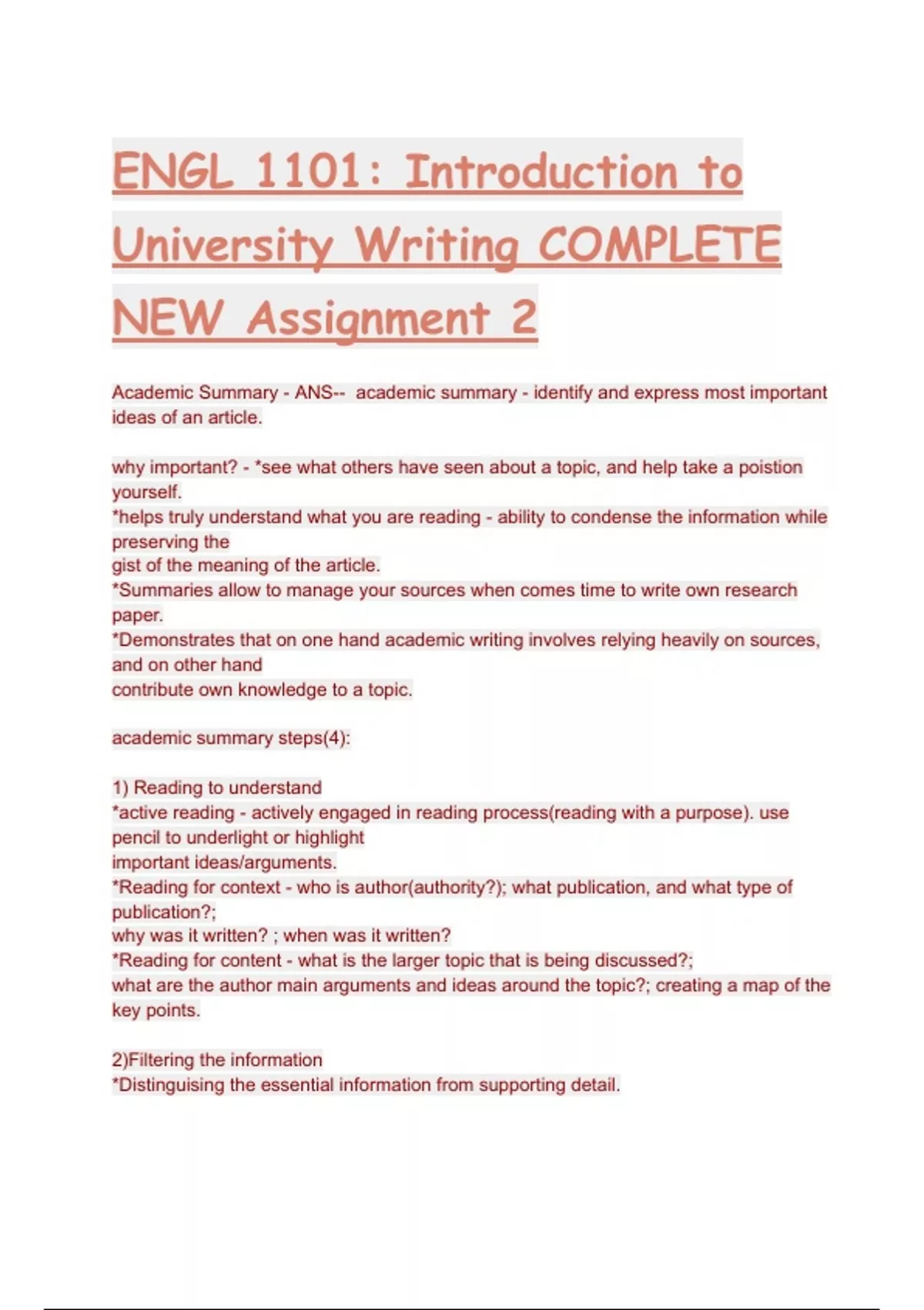 Academic Summary - ANS-- academic summary - identify and express most important ideas of an article. why important? - *see what others have seen about a topic, and help take a poistion yourself. *helps truly understand what you are reading - ability to condense the information while preserving the gist of the meaning of the article. *Summaries allow to manage your sources when comes time to write own research paper. *Demonstrates that on one hand academic writing involves relying heavily on sources, and on other hand contribute own knowledge to a topic. academic summary steps(4): 1) Reading to understand *active reading - actively engaged in reading process(reading with a purpose). use pencil to underlight or highlight important ideas/arguments. *Reading for context - who is author(authority?); what publication, and what type of publication?; why was it written? ; when was it written? *Reading for content - what is the larger topic that is being discussed?; what are the author main arguments and ideas around the topic?; creating a map of the key points. 2)Filtering the information *Distinguising the essential information from supporting detail. *Creating a reverse outline of the article(topic/main idea/key points(function/content)) - work backwards from the article to produce what the author may have used as an outline of the main ideas. Each key point has function and content. 3) Writing the summary *Consider the writing style of the summary: Want to keep paragraphs short; focusing on the main ideas/arguments, moving from point to point to represent the logical development of the argument; use formal academic language; avoid large chunks of direct quotes; *language of attribution - while writing in own words, will need to attribute the ideas/arguments as having come from the author; use attributive verbs, subjective or objective depe Critical Comparison - ANS-- *Critical comparison essay - compares and contrasts what two authors have said about the same topic; considers why does each writer take the position they do? - what assumptions do they make about a topic, and how do these assumptions affect their claims and ideas about that topic? why important? - looks at what different people say about same topic, and therefore give broader understanding of the topic at large- how and why did they develop these diverse opinions about the same topic/issue?; Encourages to make connections between texts, in order to generate interesting analysis; looking at different perspectives/opinions/arguments will help us to develop our own perspective/ideas about the topic at hand. critical comparison steps (4): 1) Summarizing the information Need a strong understanding of the articles' ideas/arguments/assumptions in order to compare them critically; developing reverse outlines can help 2) Identifying key issues and debates *Need to understand what each article says as a part of the larger conversation in society; authors dont write in a vacuum - they write in response to other writers/sharing&debating ideas/perspectives shaped by what theyve read in past; once understand this, can use the articles to map the larger social conversations; *Sample questions to ask: what do different writers say about this topic? how do writers define the topic? why do the writers define the topic in this way? Do writers in different fields have different views on this topic? If so, why? Many more questions could ask - exploring the different arguments/assumptions about the topic in our society. 3) Thinking critically - some critical thinking questions: what argument making?; what evidence used to support argument?; what assumptions lie behind argument?; what consequences/implications of argument? *these qu Annotated Bibliography - ANS-- *Annotated Bibliography - list of citations (each followed by short summary) that are relevant to a particular research topic. why important? - collecting sources for bibiliography important, but when have to write annotations, forced to read each source more carefully and critically; when considering the research topic/question, allows to synthesize information that helps determine its usefulness in relation to the topic/questions; allow to see what has been done, and where your own research/scholarship can fit - better able to develop own position on the topic. Annotated Bibliography steps (3) 1) Developing a research question *defining goal/scope of research so not drowning in information; once general topic chosen,3 steps: focus scope topic into manageable research question; identifying what kinds of info will need to address the research question (what want to know about topic? what problems connected to topic? social debates around topic? why topic important?); identify key search terms/strategies can use to search for information(to use in search engines - fully formed sentences wont produce balanced/quality research you need). 2) Finding and evaluating sources *Use quality search tools and know when see a good source. 3) Preparing the annotated bibliography *Citation (style suitable for filed - apa in this case); annotation (100-300 word paragraph: includes - summary( main argument/conclusion), is source credible to contribute meaninfully to topic?, what position take?, how position differ from other positions?, usefulness in answering research question?) Research Paper - ANS-- *Research paper - expanded essay that presents own interpretation of or argument on a topic. *why important? - Reflect intellectual demands of university scholarly activities: requires writer to support position by drawing on complex arguments from multiple sources(each source must understand/analyze/ synthesize/evaluate) - can identify gaps in knowledge which could lead to further research. Increases your knowledge on topic have chosen to talk about. Can promote curiosity. Research paper steps (4) 1)Employing rhetorical (typical) moves in scholarly introductions *Heres my topic; heres whats been done; heres wh