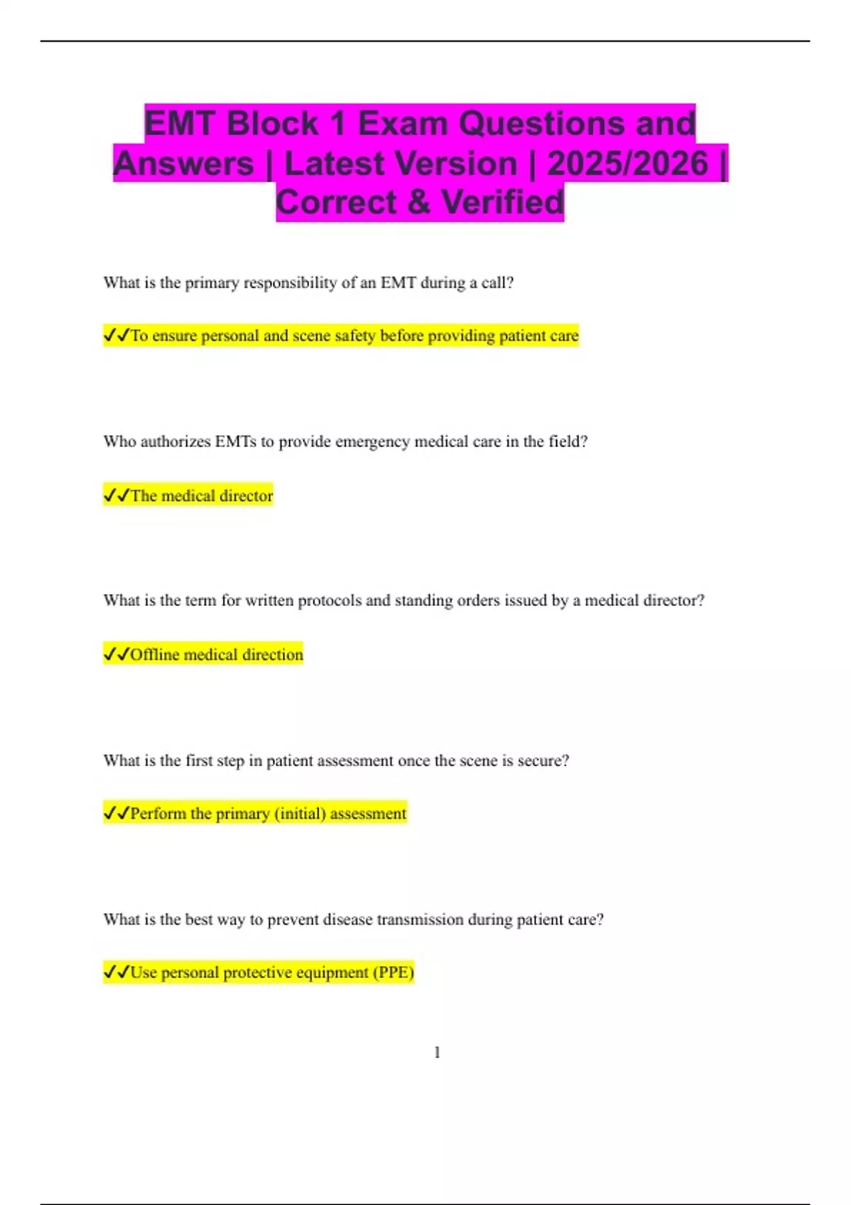 EMT Block 1 Exam Questions and Answers | Latest Version | 2025/2026 | Correct & Verified