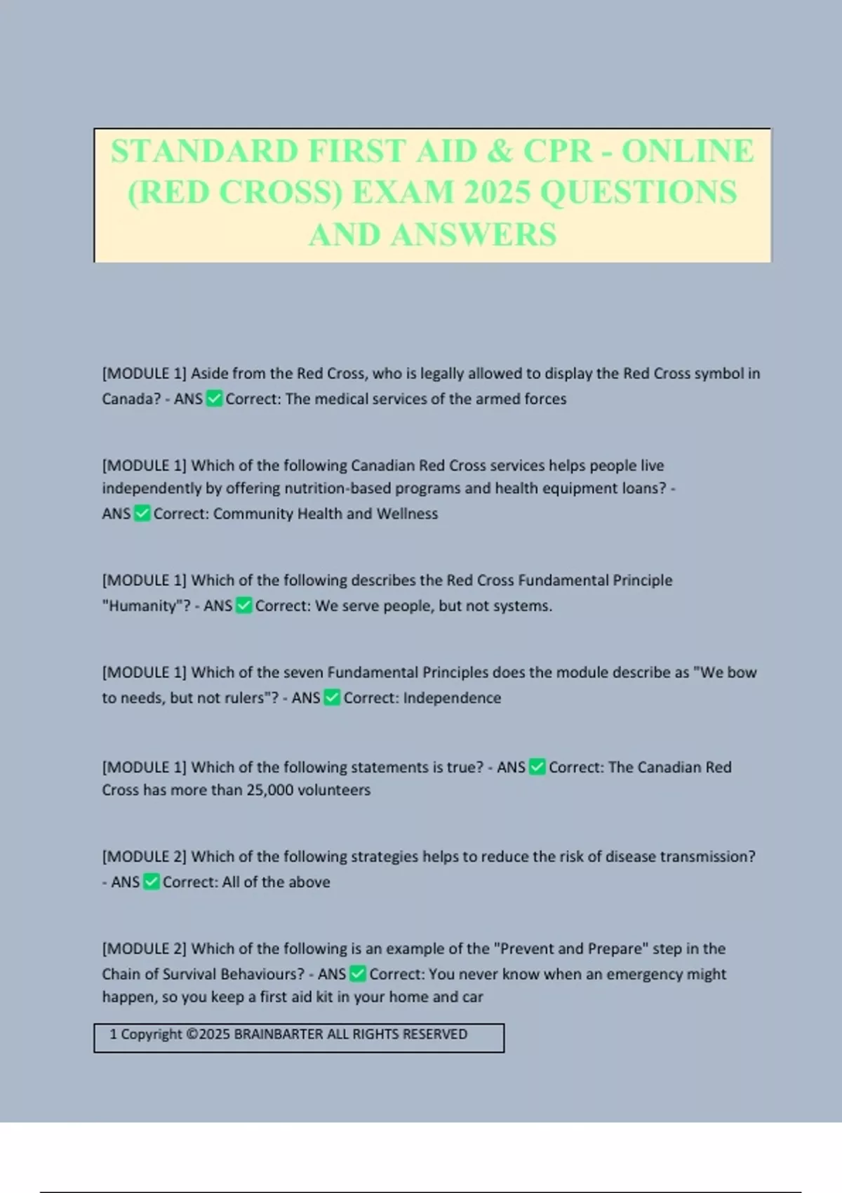 MODULE 1] Aside from the Red Cross, who is legally allowed to display the Red Cross symbol in Canada? - ANS Correct: The medical services of the armed forces [MODULE 1] Which of the following Canadian Red Cross services helps people live independently by offering nutrition-based programs and health equipment loans? - ANS Correct: Community Health and Wellness [MODULE 1] Which of the following describes the Red Cross Fundamental Principle "Humanity"? - ANS Correct: We serve people, but not systems. [MODULE 1] Which of the seven Fundamental Principles does the module describe as "We bow to needs, but not rulers"? - ANS Correct: Independence [MODULE 1] Which of the following statements is true? - ANS Correct: The Canadian Red Cross has more than 25,000 volunteers [MODULE 2] Which of the following strategies helps to reduce the risk of disease transmission? - ANS Correct: All of the above [MODULE 2] Which of the following is an example of the "Prevent and Prepare" step in the Chain of Survival Behaviours? - ANS Correct: You never know when an emergency might happen, so you keep a first aid kit in your home and car STANDARD FIRST AID & CPR - ONLINE (RED CROSS) EXAM 2025 QUESTIONS AND ANSWERS 2 Copyright ©2025 BRAINBARTER ALL RIGHTS RESERVED [MODULE 2] What does the law assume a "reasonable and prudent" First Aider will do when helping an ill or injured person? - ANS Correct: Call EMS/9-1-1 if necessary [MODULE 2] When are you legally required to report a disclosure of child abuse or neglect? - ANS Correct: You are always legally required to report any disclosure of child abuse or neglect [MODULE 2] Which of the following conditions always requires you to call EMS/9-1-1? - ANS Correct: Unresponsiveness [MODULE 3] Which of the following shows you that a person's airway is open? - ANS Correct: The person is moaning softly [MODULE 3] Which of the following statements about the secondary assessment is true? - ANS Correct: You should only perform a secondary assessment if the person doesn't have life-threatening conditions that require care [MODULE 3] Which of the following is an example of a SAMPLE question? - ANS Correct: What is the last thing you ate or drank? [MODULE 3] Which of the following is a sign or symptom of shock? - ANS Correct: Weakness, excessive thirst, confusion [MODULE 3] If you see an ill or injured person, what should you do first? - ANS Correct: Check the scene for hazards [MODULE 4] When should you perform CPR on a choking person? - ANS Correct: If the person becomes unresp