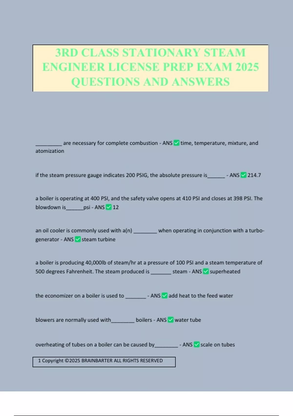 _________ are necessary for complete combustion - ANS time, temperature, mixture, and atomization if the steam pressure gauge indicates 200 PSIG, the absolute pressure is______ - ANS 214.7 a boiler is operating at 400 PSI, and the safety valve opens at 410 PSI and closes at 398 PSI. The blowdown is______psi - ANS 12 an oil cooler is commonly used with a(n) ________ when operating in conjunction with a turbo- generator - ANS steam turbine a boiler is producing 40,000lb of steam/hr at a pressure of 100 PSI and a steam temperature of 500 degrees Fahrenheit. The steam produced is _______ steam - ANS superheated the economizer on a boiler is used to _______ - ANS add heat to the feed water blowers are normally used with________ boilers - ANS water tube overheating of tubes on a boiler can be caused by________ - ANS scale on tubes 3RD CLASS STATIONARY STEAM ENGINEER LICENSE PREP EXAM 2025 QUESTIONS AND ANSWERS 2 Copyright ©2025 BRAINBARTER ALL RIGHTS RESERVED carbon dioxide in a condensate return system causes_________ - ANS channeling a ________ pump is a positive displacement pump - ANS reciprocating a boiler generating 6000 lb of steam/hr produces _______btu/hr - ANS 6,000,000 a bottom blowdown is performed on a boiler to _____ - ANS discharge sludge and sediment water columns are connected to the boiler with a minimum of _______" pipe - ANS 1 the minimum size of a water column blowdown valve is_______". - ANS 3/4 the maximum size bottom blowdown valve on a boiler is_________". - ANS 2 1/2 a ________ allows condensate to pass through, but stops Steam. - ANS a steam trap when taking over a shift, the first thing to do is check the________ - ANS water level in each boiler according to the asme code, a high-pressure boiler having more than 500 square feet of heating surface shall have________ - ANS two or more safety valves the probable cause of an increase in temperature of gases of combustion at the boiler Outlet is____ - ANS dirty heating services boilers in battery equipped with________ must have two main steam stop valves and a free- flowing drain between them - ANS manhole openings 3 Copyright ©2025 BRAINBARTER ALL RIGHTS RESERVED in order to be sure the gauge glass is indicating an accurate water level reading, the stationary engineer should______ - ANS blowdown the gauge glass a continuous blowdown line is located___ - ANS in the Steam and water drum well below the nowl a temperature reading of 80 degrees Celsius is equal to_________°f - ANS 176 a chimney temperature of 250 degrees Fahrenheit above steam temperature indicates_______ - ANS poor efficiency a manometer is red in________ - ANS inches of water the boiling point of water will____ with an increase in pressure - ANS be raised if a lather is not obtained when performing a soap hardness test, the water sample is_______ - ANS hard combustion efficiency can be increased when air is________ - ANS preheated ______ draft is produced by a fan located between the boiler and the chimney - ANS induced the overspeed trip on a steam turbine should be tested ______ - ANS before putting the steam turbine on-line a high CO2 readin