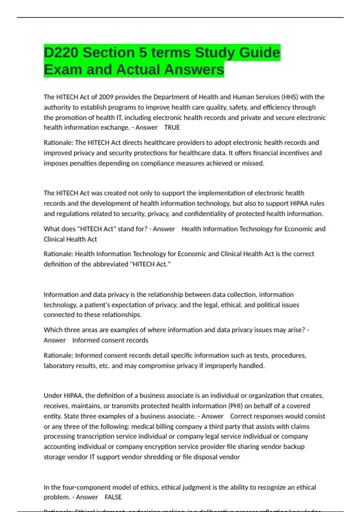 What does "HITECH Act" stand for? - Answer Health Information Technology for Economic and