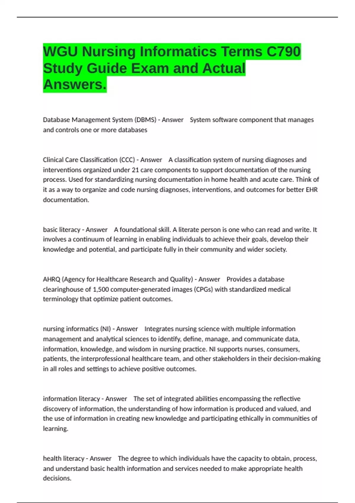 WGU Nursing Informatics Terms C790 Study Guide Exam and Actual Answers.