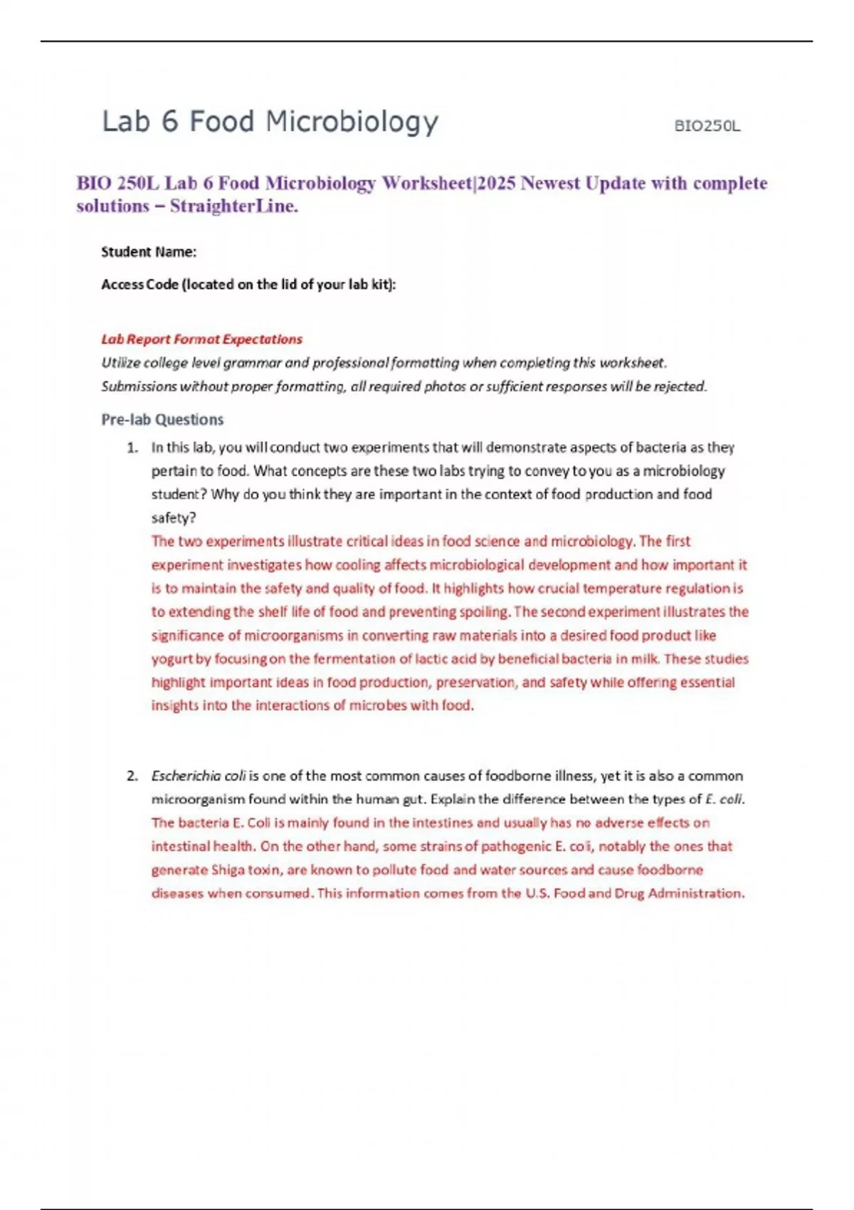 BIO 250L Lab 6 Food Microbiology Worksheet|2025 Newest Update with complete solutions – StraighterLine.