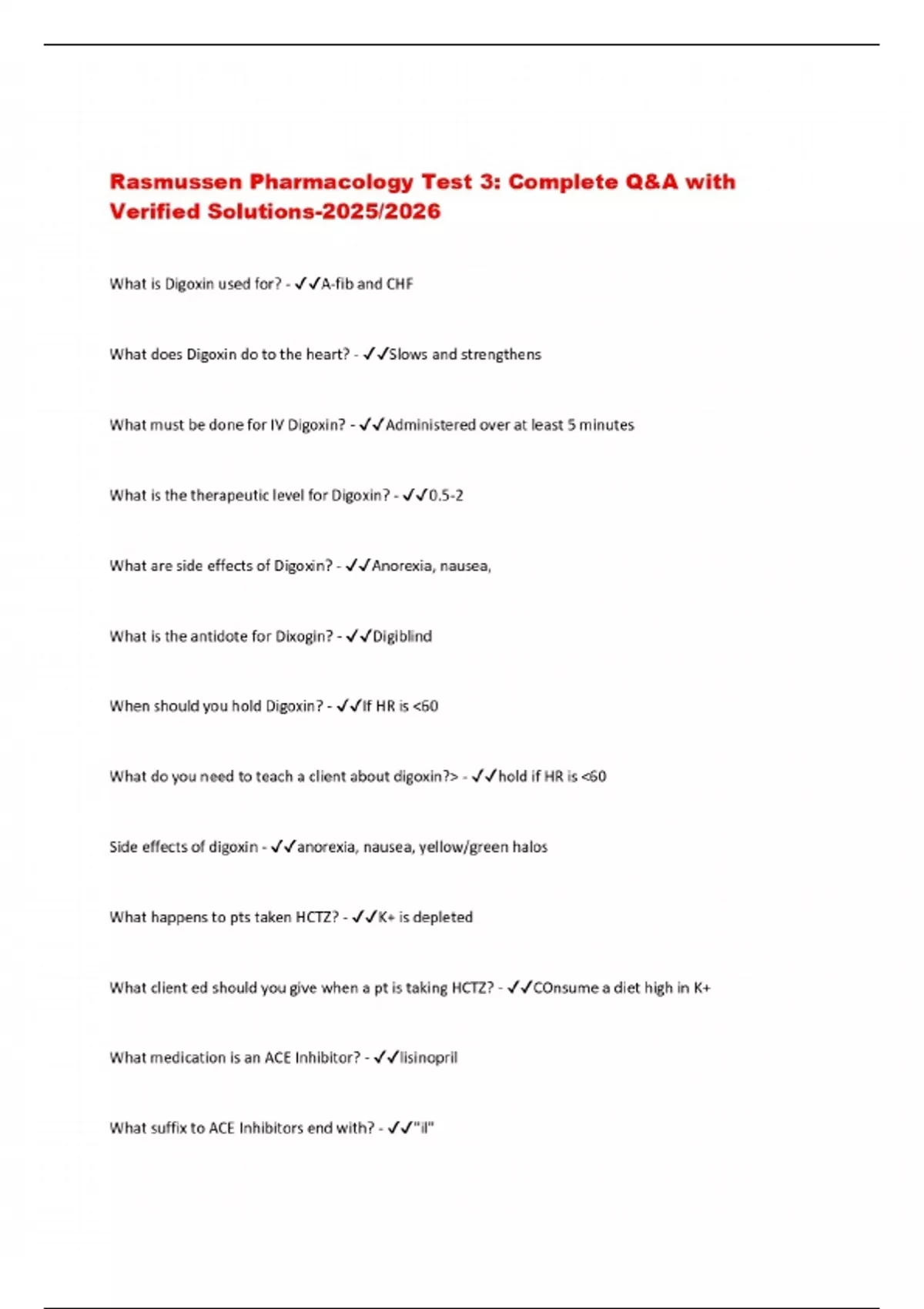 Rasmussen Pharmacology Test 3: Complete Q&A with Verified Solutions-2025/2026