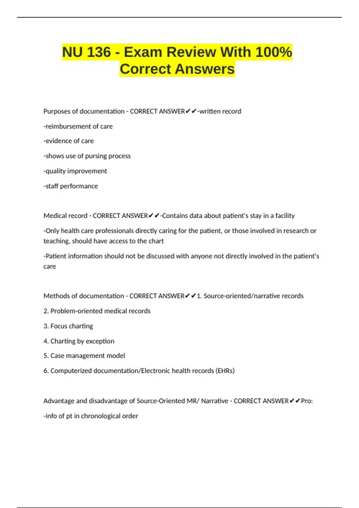 Methods of documentation - CORRECT ANSWER✔✔1. Source-oriented/narrative records