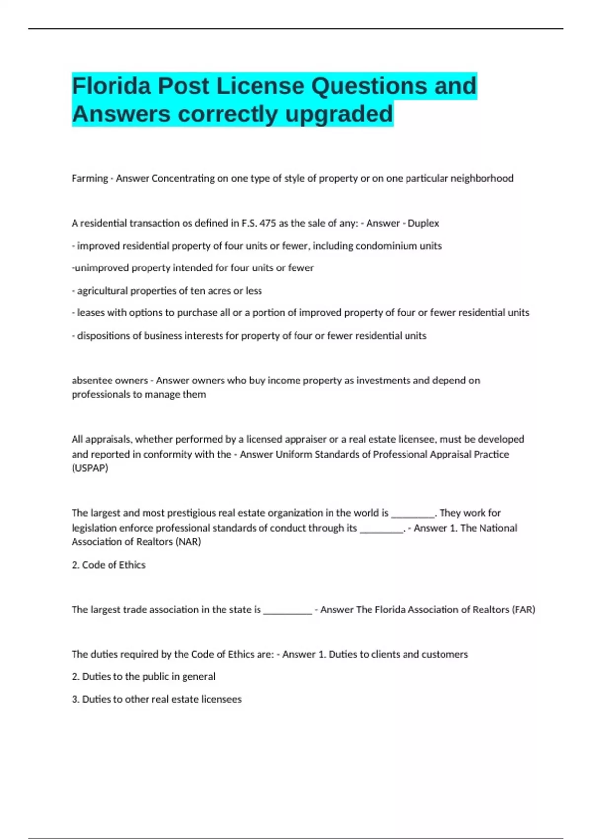 Farming - Answer Concentrating on one type of style of property or on one particular neighborhood A residential transaction os defined in F.S. 475 as the sale of any: - Answer - Duplex - improved residential property of four units or fewer, including condominium units -unimproved property intended for four units or fewer - agricultural properties of ten acres or less - leases with options to purchase all or a portion of improved property of four or fewer residential units - dispositions of business interests for property of four or fewer residential units absentee owners - Answer owners who buy income property as investments and depend on professionals to manage them All appraisals, whether performed by a licensed appraiser or a real estate licensee, must be developed and reported in conformity with the - Answer Uniform Standards of Professional Appraisal Practice (USPAP)
