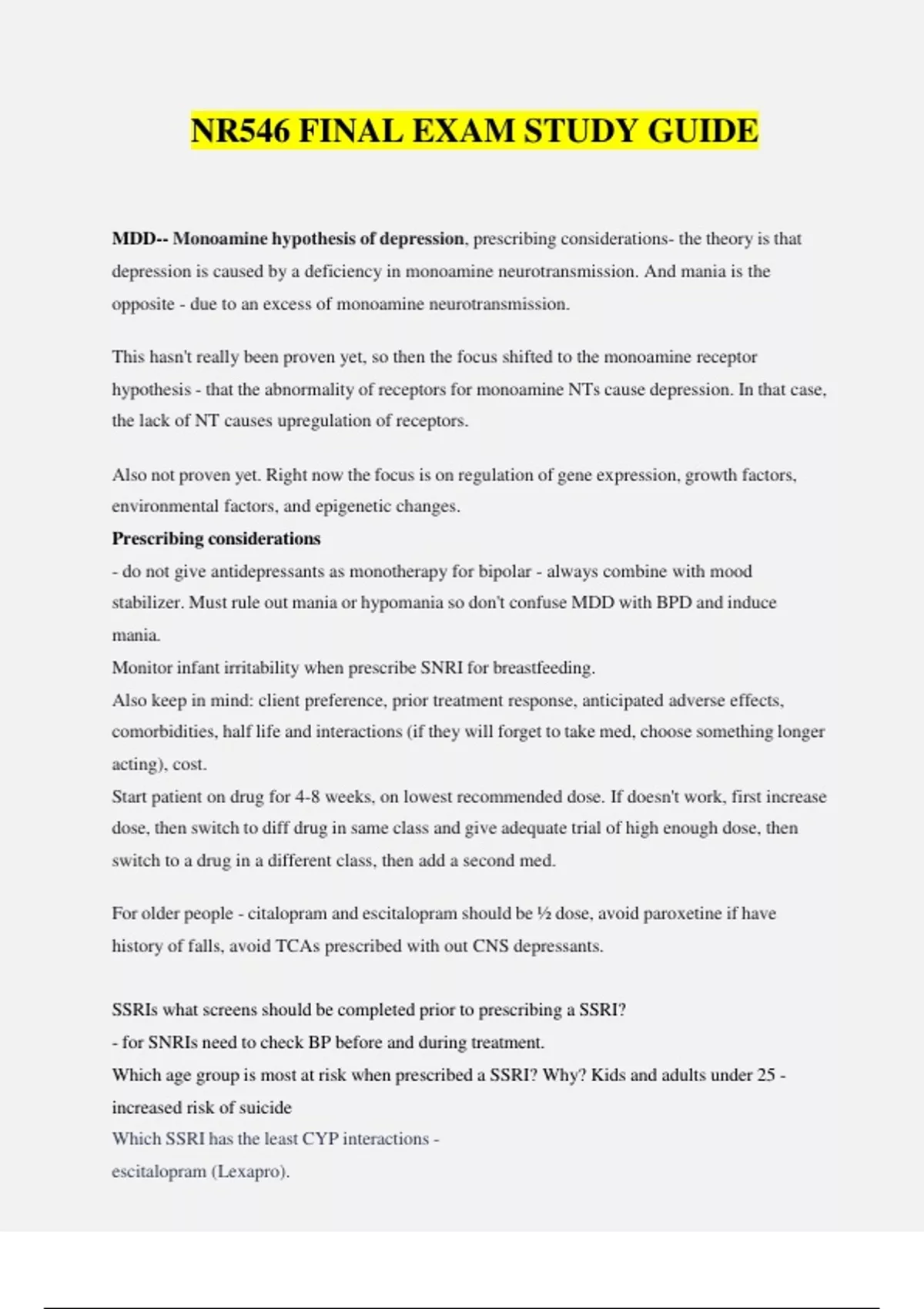 Comprehensive Review for Advanced Pharmacology in Mental Health Prepare for your NR546 Final Exam with this high-yield study guide, covering essential concepts in psychopharmacology, neurobiology, and clinical prescribing for psychiatric-mental health nurse practitioners (PMHNPs). What’s Included? 1. Psychopharmacology by Disorder Depression & Anxiety First-line SSRIs/SNRIs (e.g., sertraline, venlafaxine) Augmentation strategies (e.g., buspirone, mirtazapine) Black box warnings (suicidality, activation) Bipolar Disorder Mood stabilizers (lithium, valproate, lamotrigine) Monitoring requirements (e.g., lithium levels, renal function) Schizophrenia & Psychosis Typical vs. atypical antipsychotics (haloperidol vs. risperidone) Metabolic syndrome risks (weight gain, diabetes) ADHD & Stimulants Methylphenidate vs. amphetamines Cardiac monitoring (BP, HR) Substance Use Disorders MAT options (buprenorphine, naltrexone) Withdrawal management (CIWA, COWS scales) 2. Neurobiology & Mechanism of Action Neurotransmitters (dopamine, serotonin, GABA, glutamate) Receptor targets (e.g., 5-HT2A, D2 blockade) 3. Special Populations Pediatrics (FDA-approved meds for adolescents) Geriatrics (Beers Criteria, dose adjustments) Pregnancy (teratogenic risks, safest options) 4. Clinical Decision-Making Case studies (e.g., "Bipolar patient with CKD—best lithium alternative?") Drug interactions (e.g., SSRI + MAOI = serotonin syndrome) 5. Test-Taking Strategies How to approach "select all that apply" (SATA) questions Lab value mnemonics (e.g., "LITHIUM" for toxicity signs) Why Use This Guide? Exam-Focused: Covers 100% of NR546 final exam topics. Time-Saving: Summarizes must-know drugs and guidelines. Clinical Ready: Teaches real-world prescribing judgment. Perfect For: PMHNP students in NR546. Clinicians prepping for boards (ANCC PMHNP). Study groups reviewing high-yield content. Master psychopharmacology—pass your final with confidence!