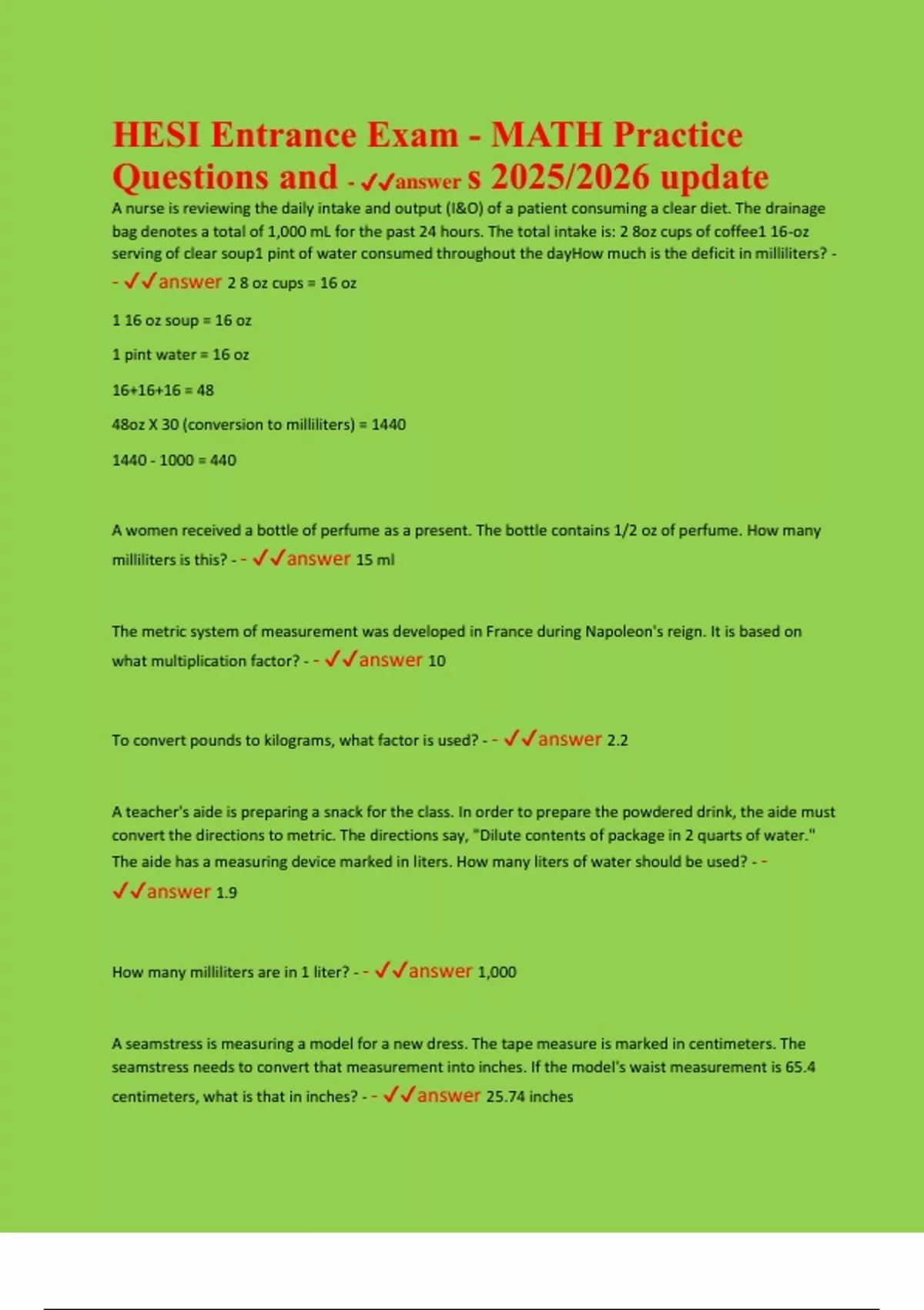 HESI Entrance Exam - MATH Practice Questions and - answer s 2025/2026 update