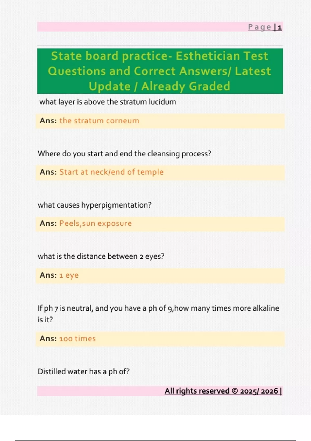 State board practice- Esthetician Test Questions and Correct Answers/ Latest Update / Already Graded